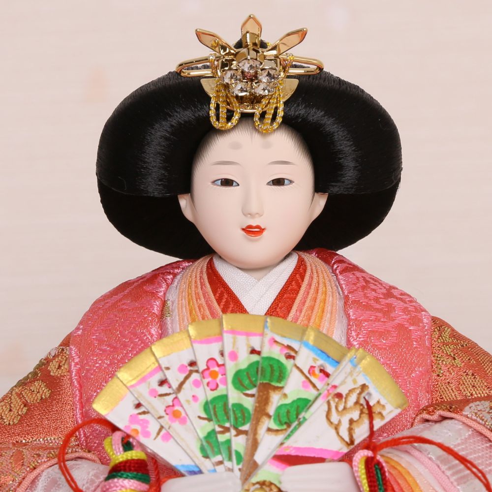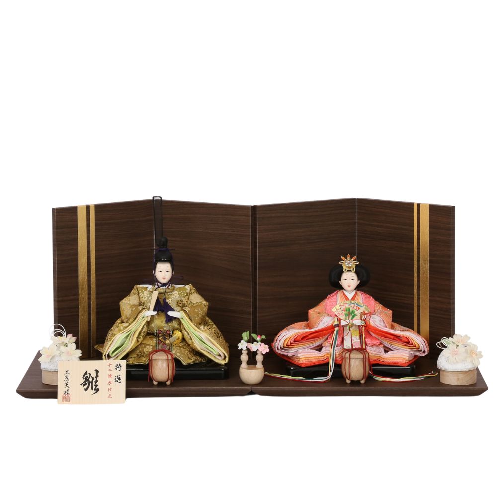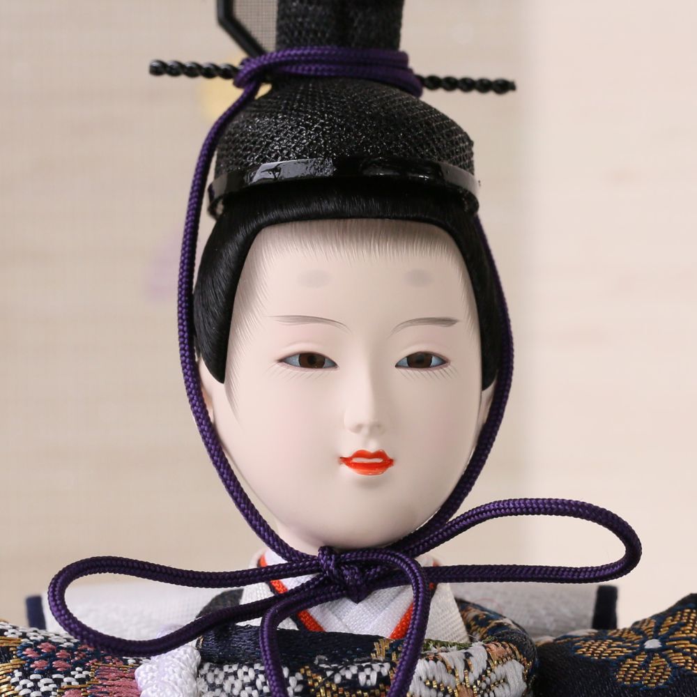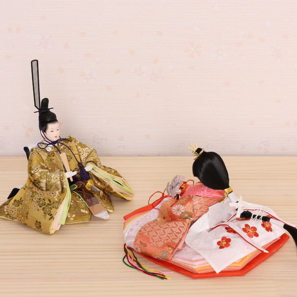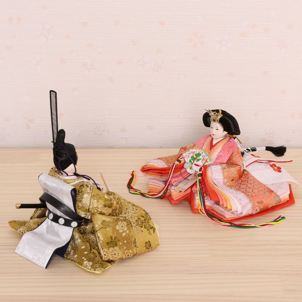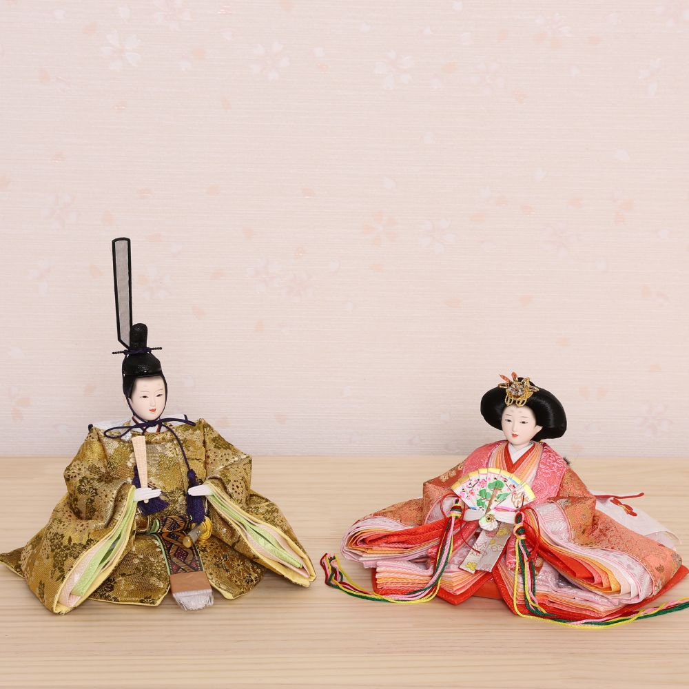 男雛には渋めな色合わせ、女雛にはピンク色を基調とした古典柄、京都西陣金襴織物の上質感が魅力的な親王飾りです。