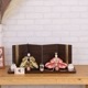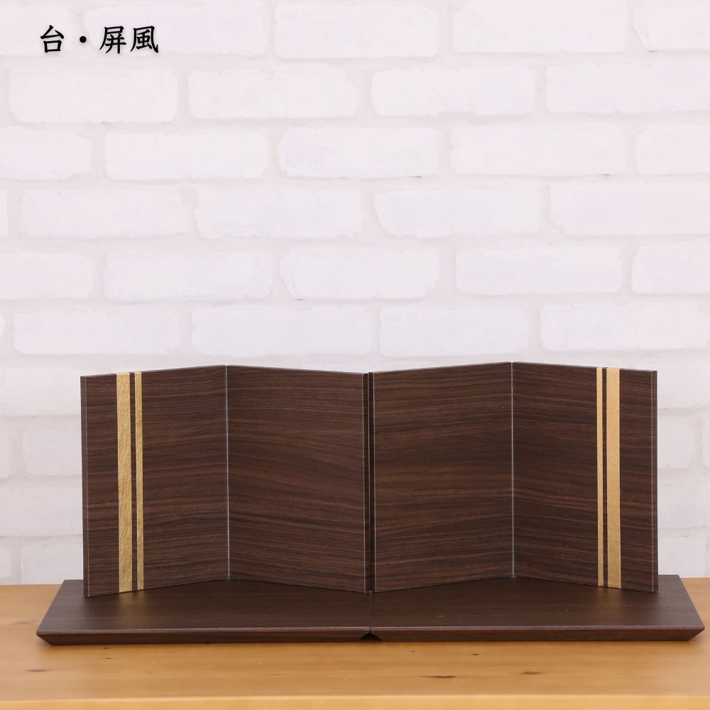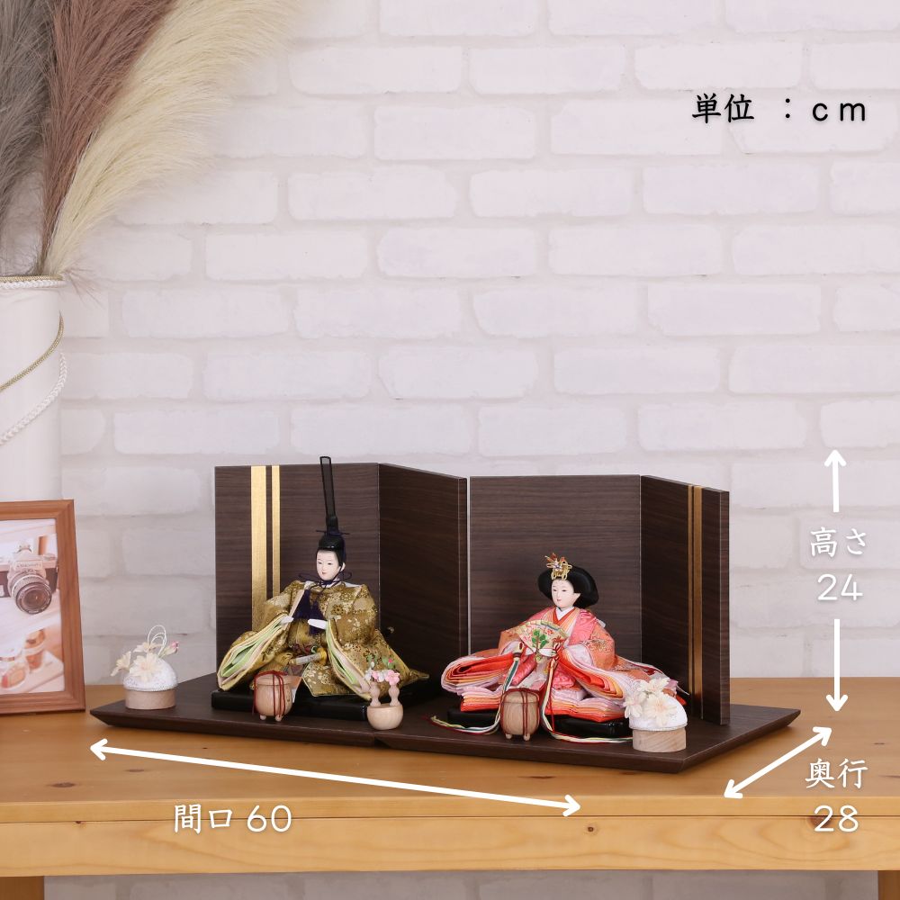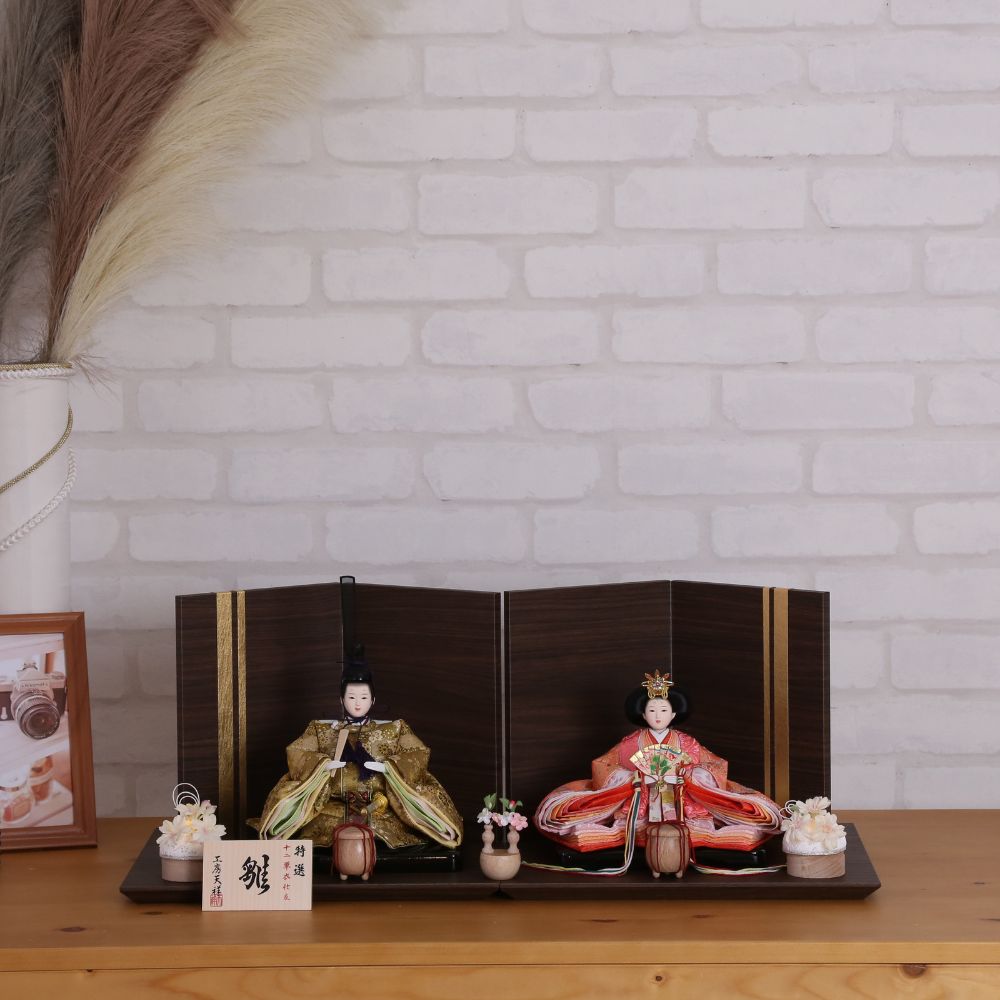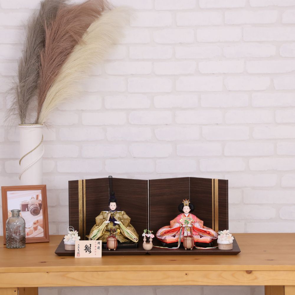落ち着いた色合いの木目調の台屏風セットによって、内裏雛の美しさがより際立っています。