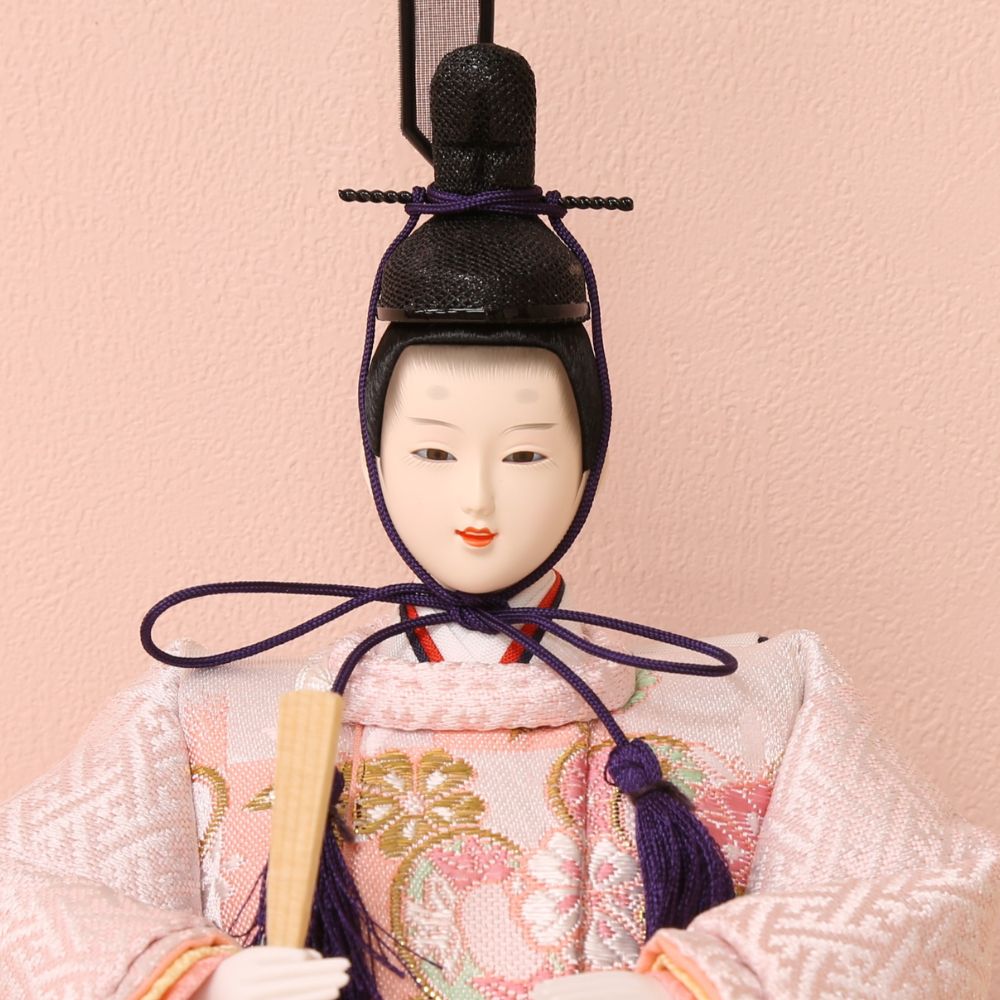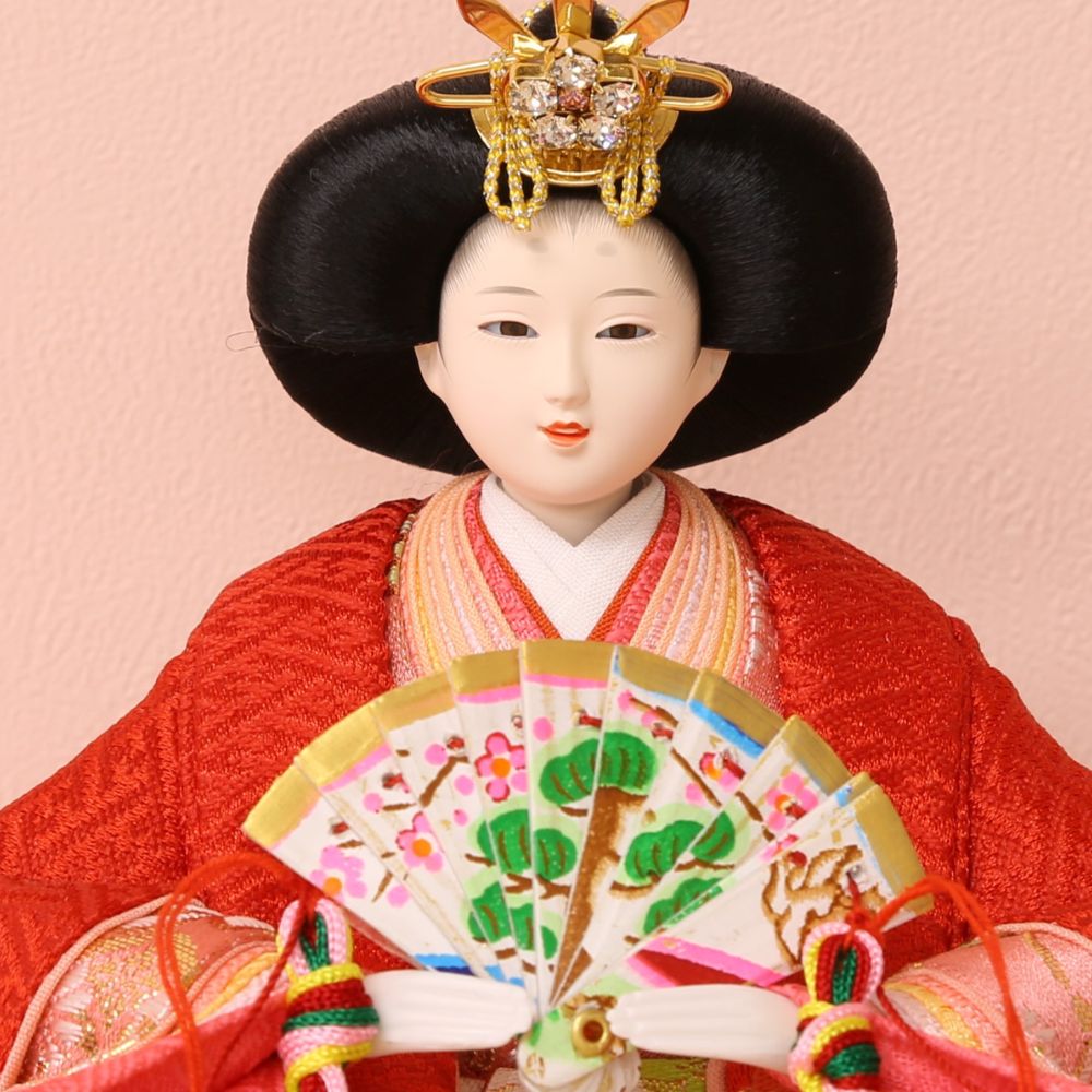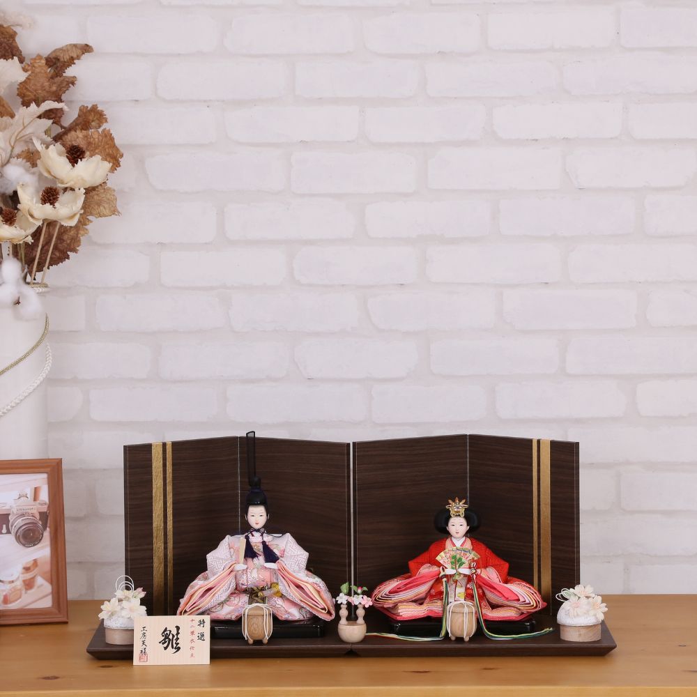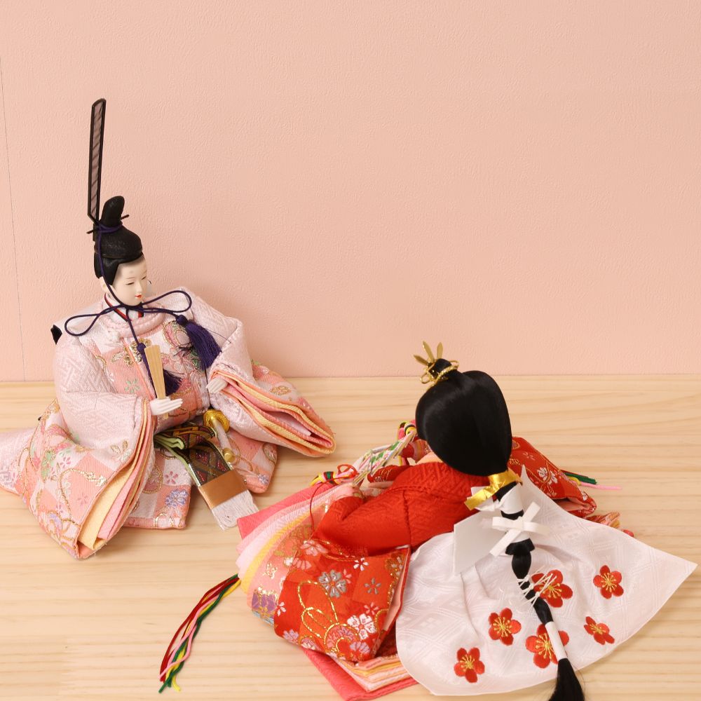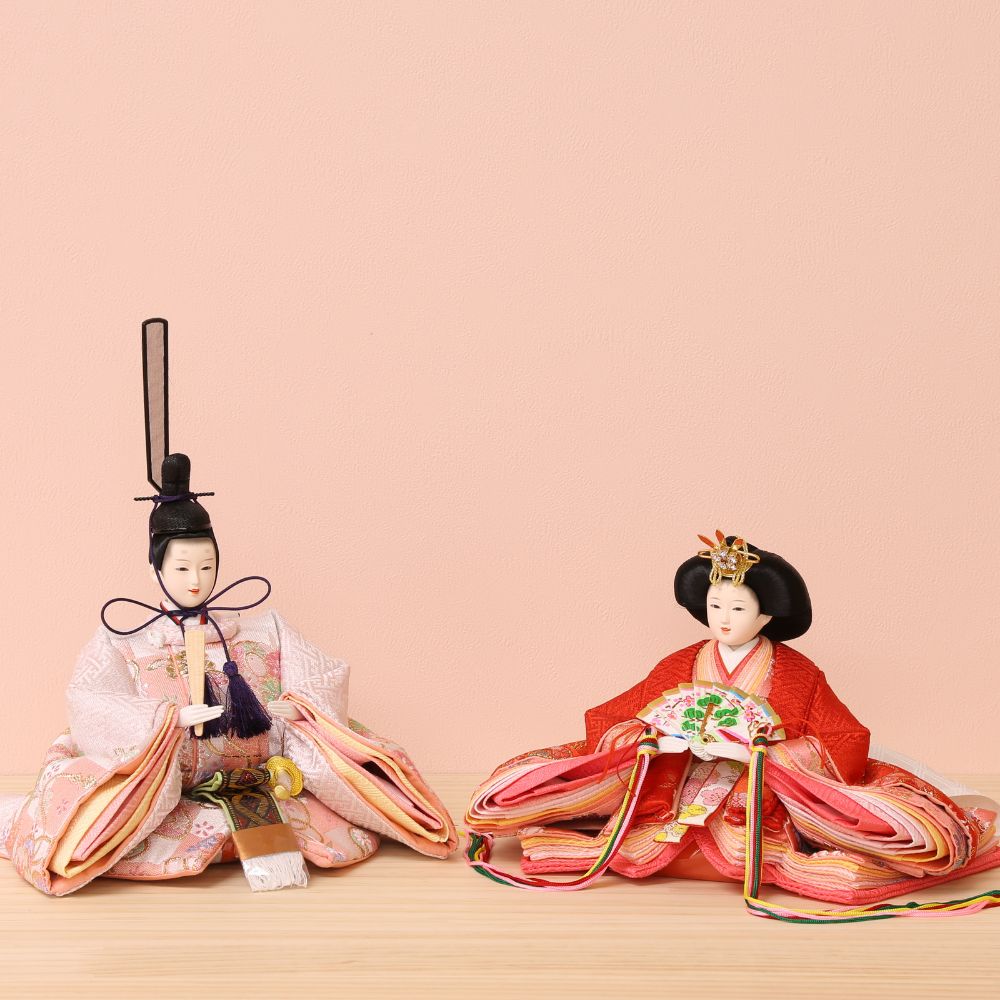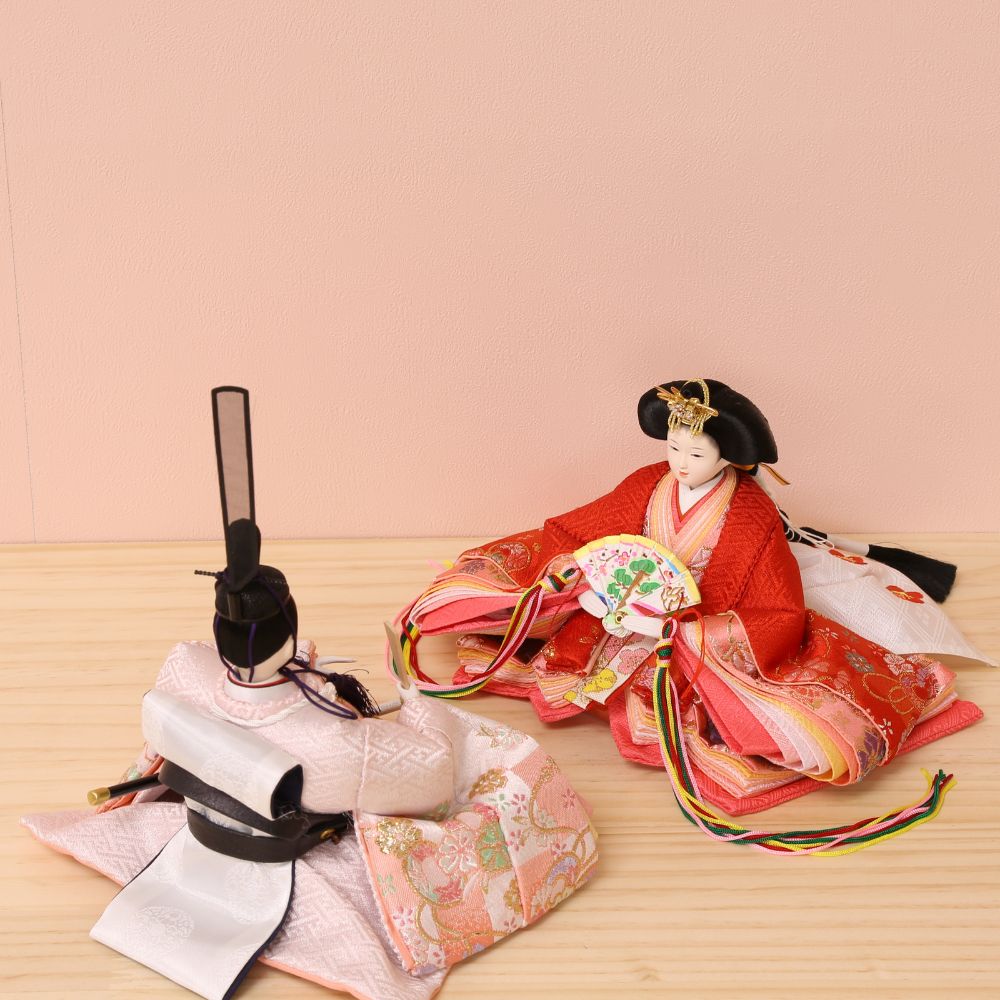 男雛には淡い色合い、女雛には赤色を基調とした古典柄、女の子のお節句ならではの色使いが魅力的な親王飾りです。