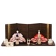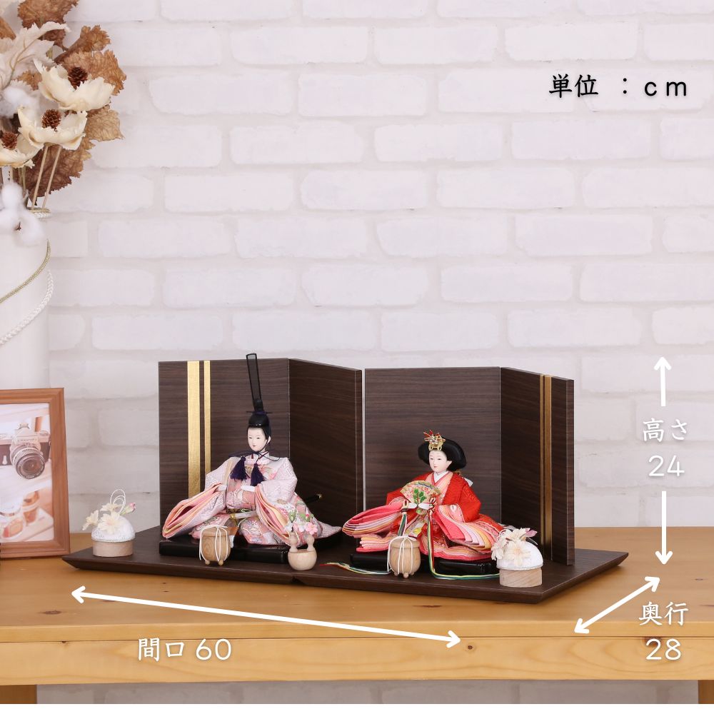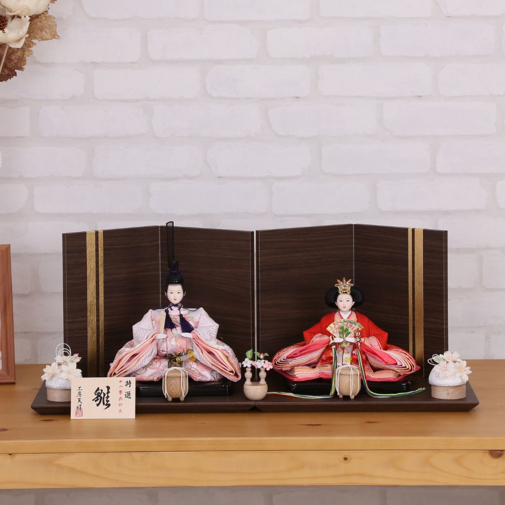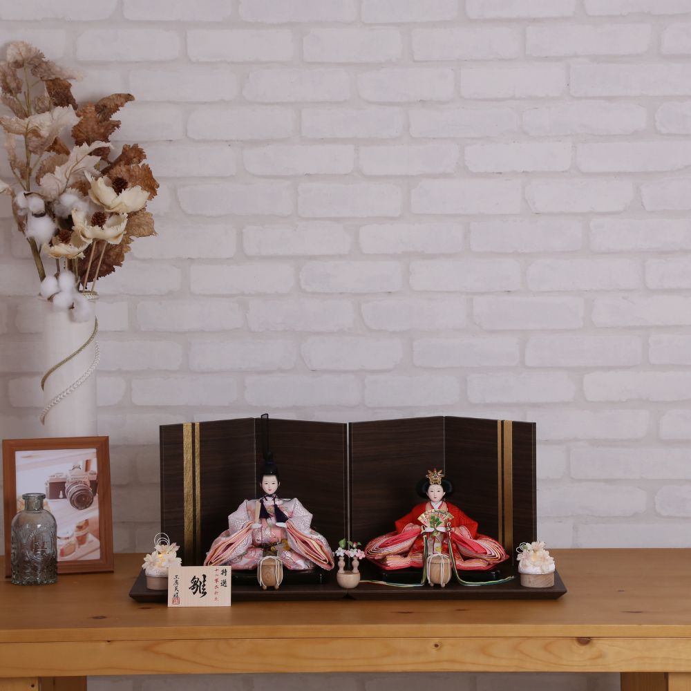 落ち着いた色合いの木目調の台屏風セットによって、内裏雛の美しさがより際立っています。