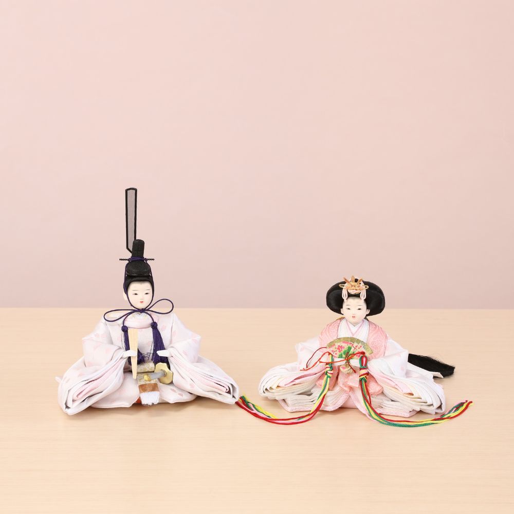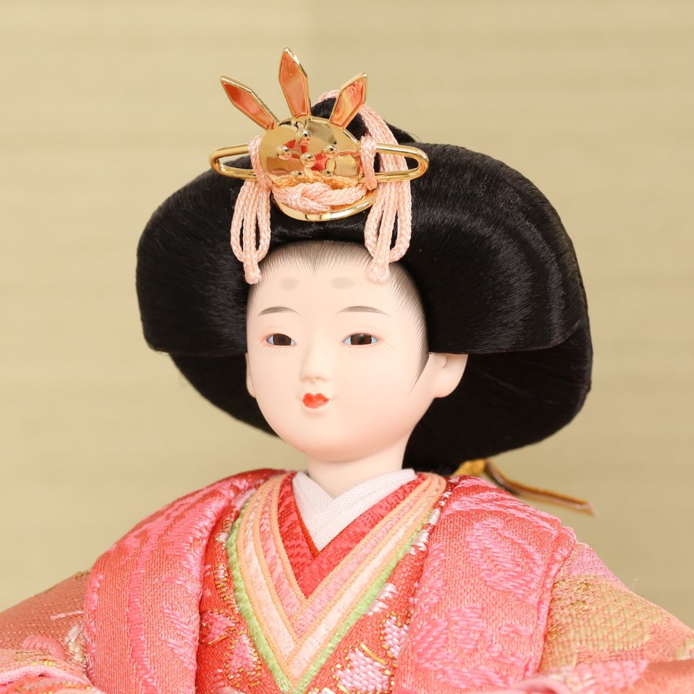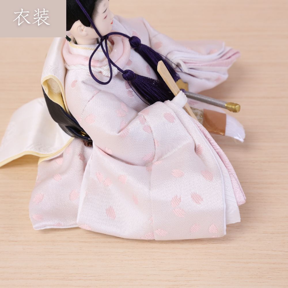 桜の花びら柄が舞う様子の、京都西陣金襴織物のお衣装は、男雛と女雛が同じ色柄の共布(ともぎれ)で仕立てられた、「末永く共に一緒」という意味合いが込められた縁起物の雛人形です。