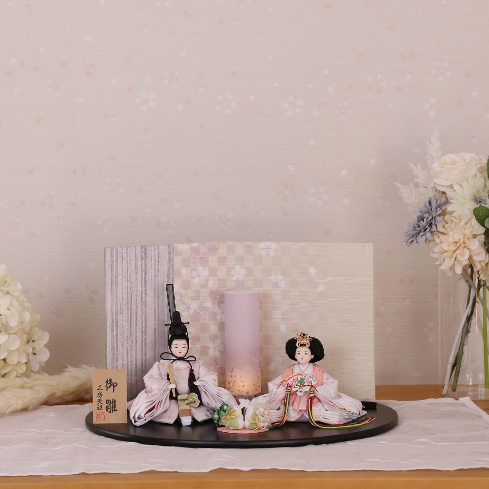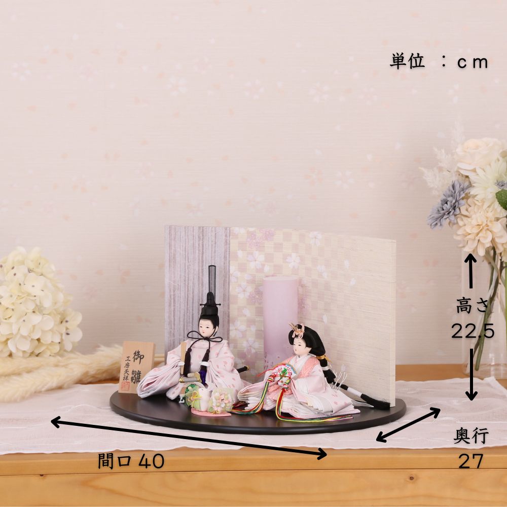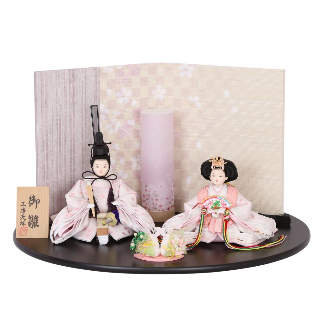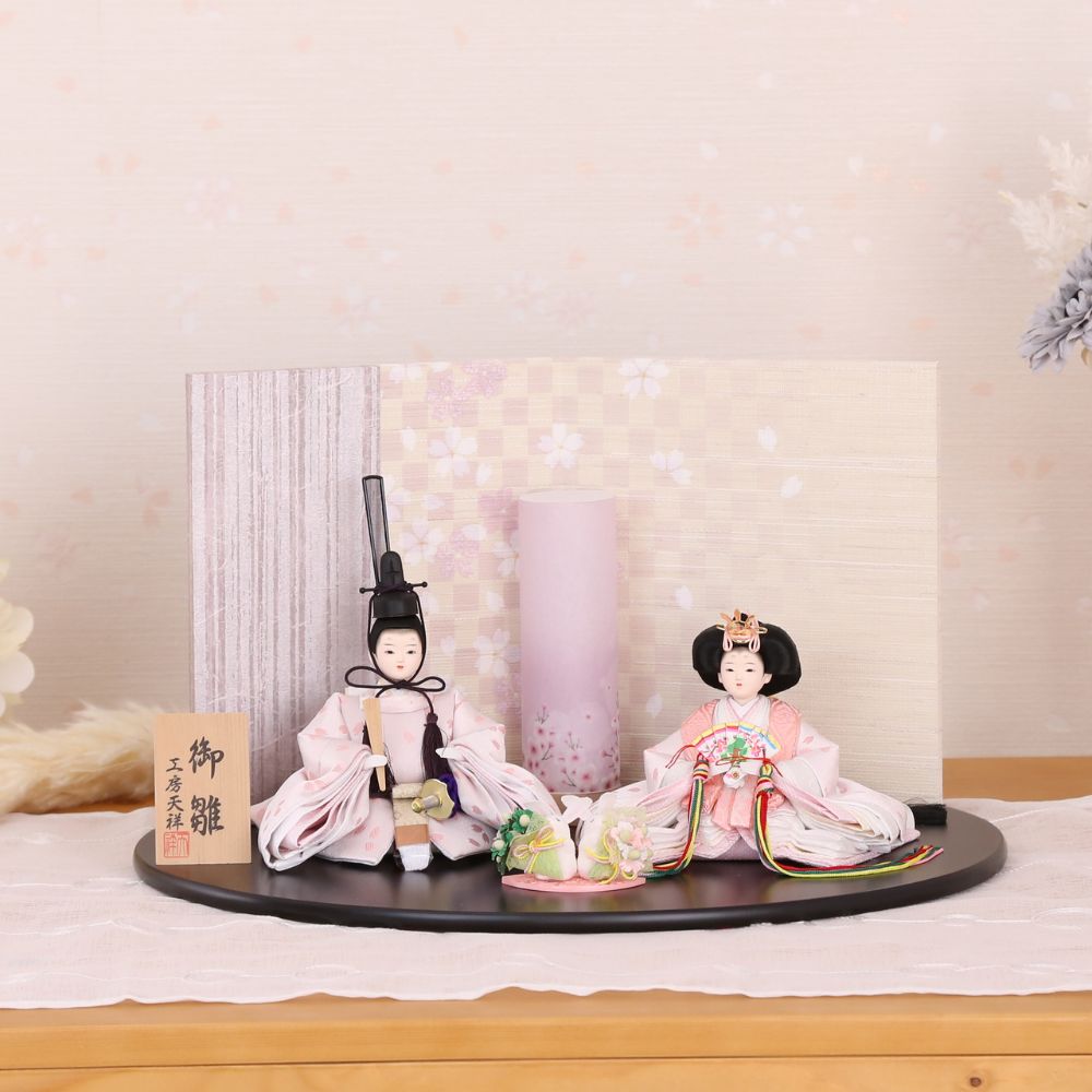 桜の花びら柄が舞う様子の、京都西陣金襴織物のお衣装は、男雛と女雛が同じ色柄の共布(ともぎれ)で仕立てられた、「末永く共に一緒」という意味合いが込められた縁起物の雛人形です。