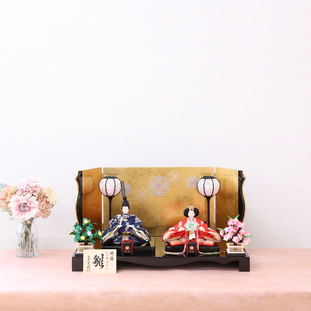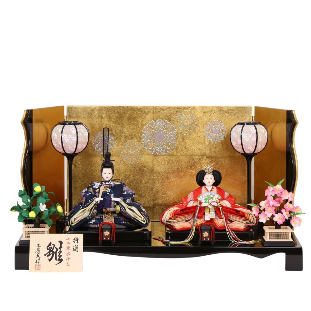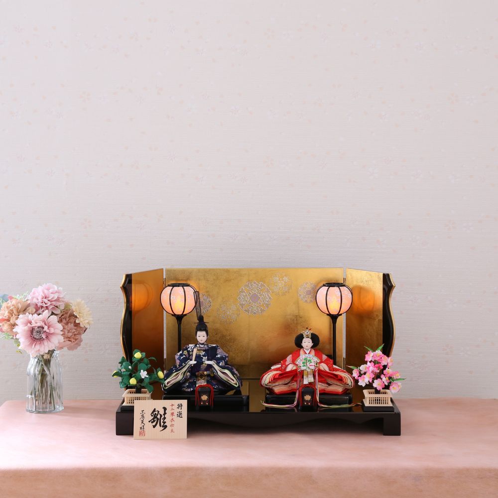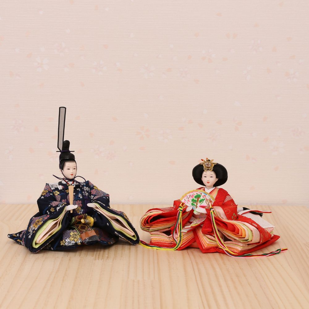 そしてお衣裳は、男雛には紺色、女雛には赤を基調とし古典的花模様柄を織り出した京都西陣金襴織物から仕立てています。
