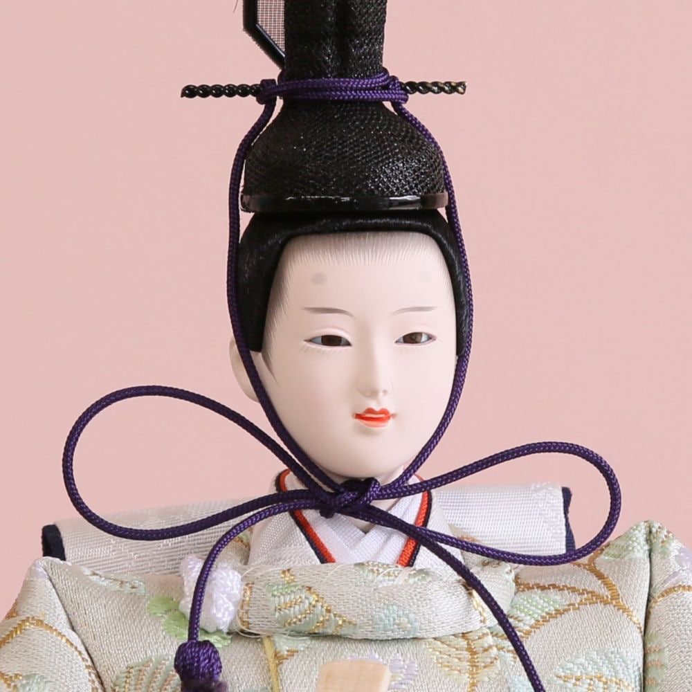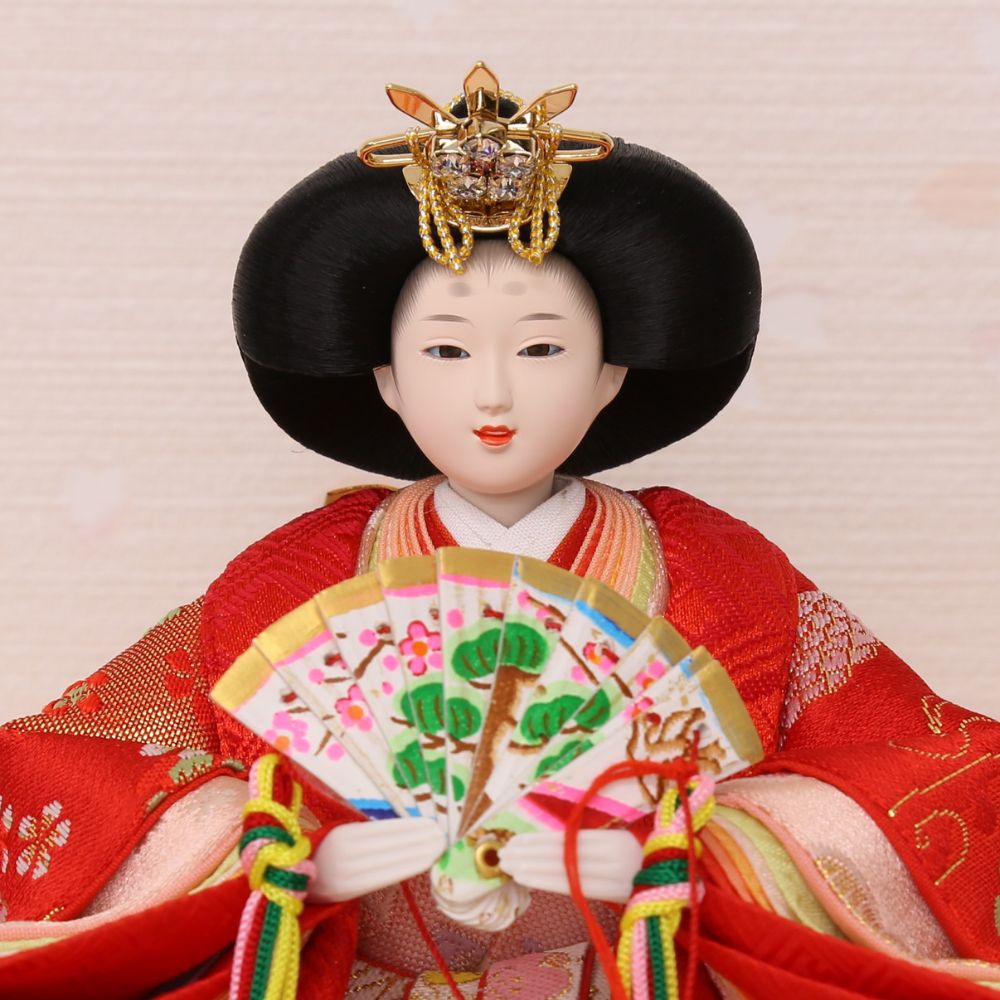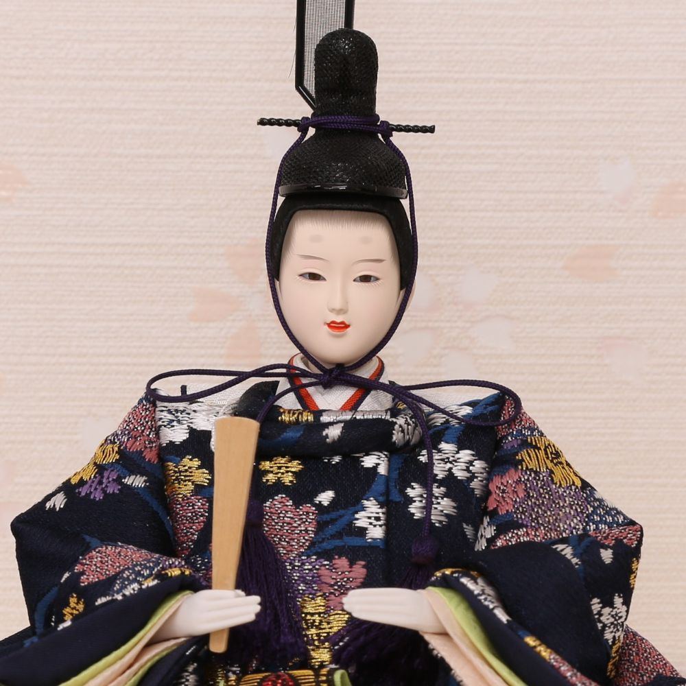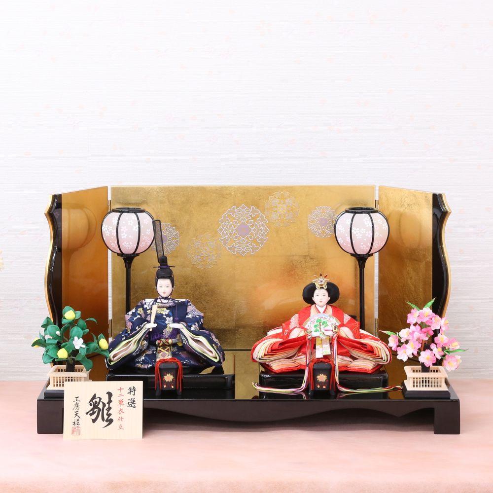 そしてお衣裳は、男雛には紺色、女雛には赤を基調とし古典的花模様柄を織り出した京都西陣金襴織物から仕立てています。