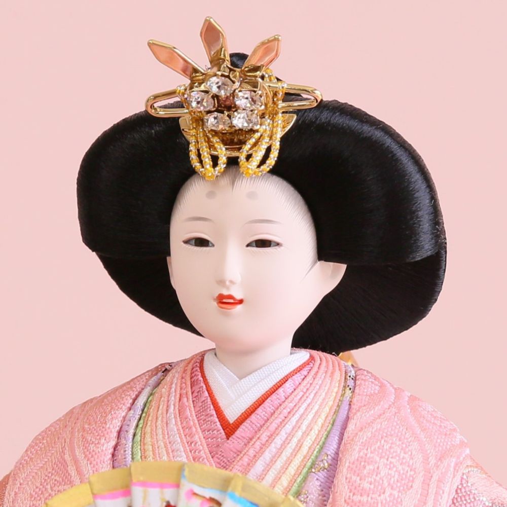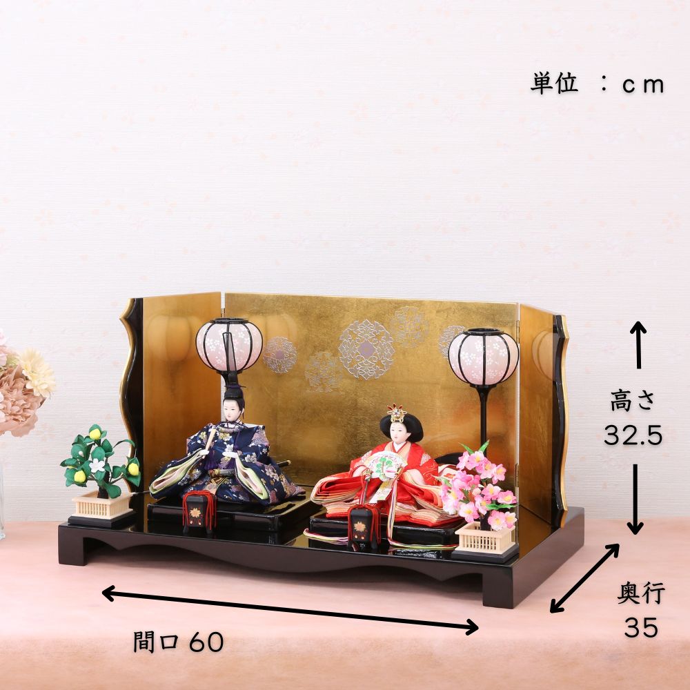 また、当店限定オリジナルのぷり姫シリーズは、キラキラ輝くストーンのついたティアラ風な玉串や、お顔はプリンセス仕様、現代風に仕上げた雛人形です。 間口(横幅)60×奥行35×高さ32.5(cm)サイズ