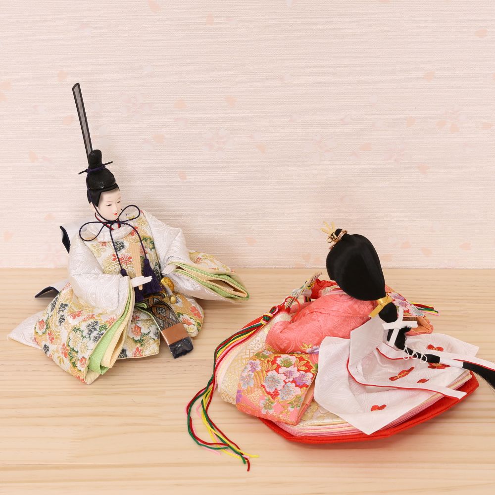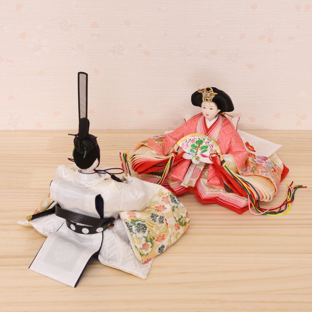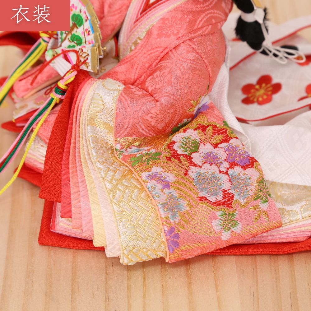そしてお衣裳は、男雛には白色、女雛にはピンクを基調とし小桜柄を織り出した京都西陣金襴織物から仕立てています。