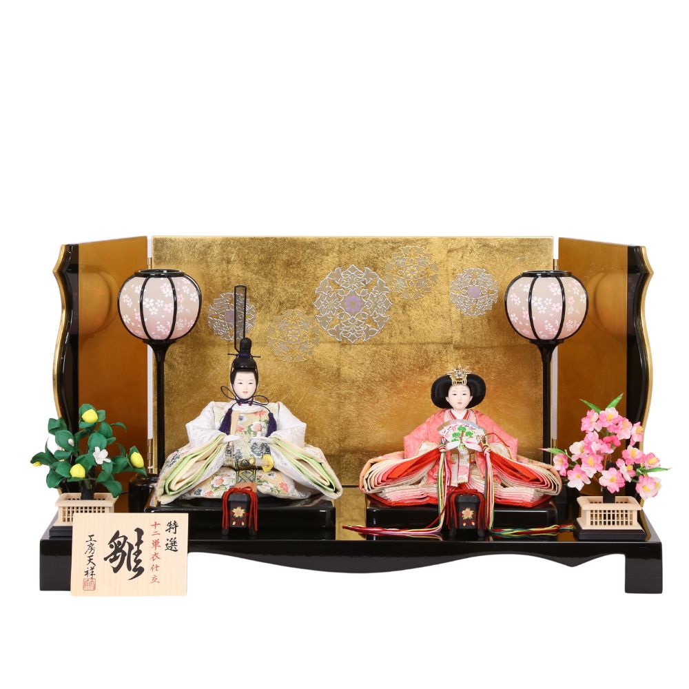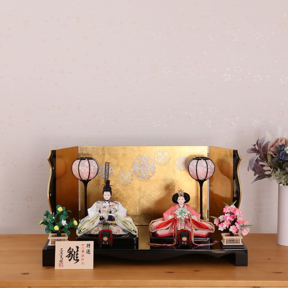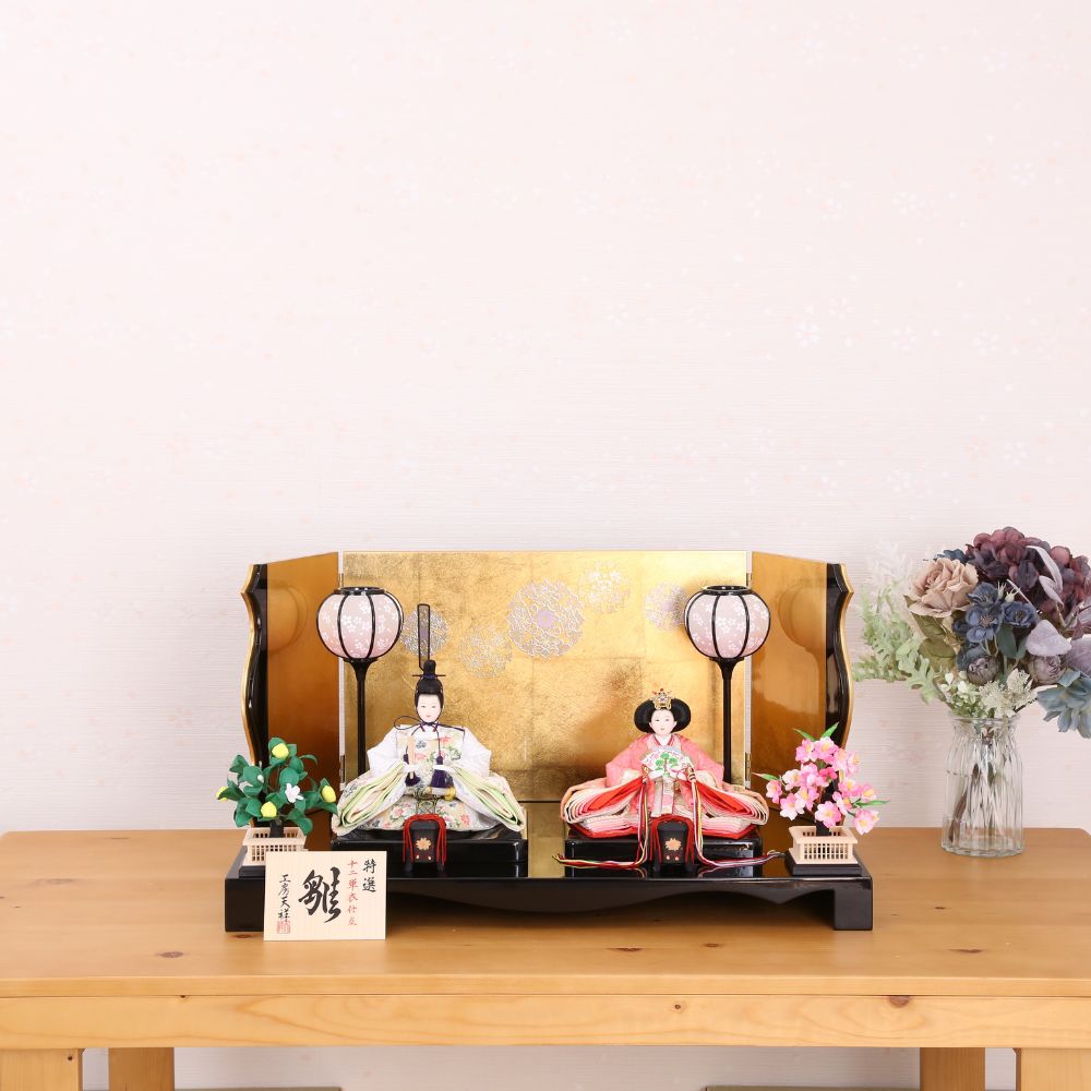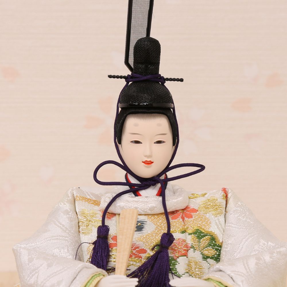 そしてお衣裳は、男雛には白色、女雛にはピンクを基調とし小桜柄を織り出した京都西陣金襴織物から仕立てています。