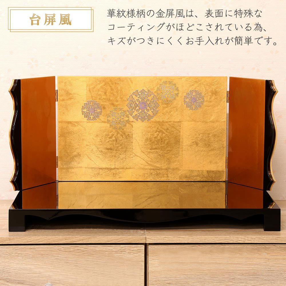 華紋様柄の金屏風は、表面に特殊なコーティングがほどこされている為、キズがつきにくくお手入れが簡単です。また、横幅60cmは大き過ぎることなく小さすぎず、一番人気の高いサイズ感です。