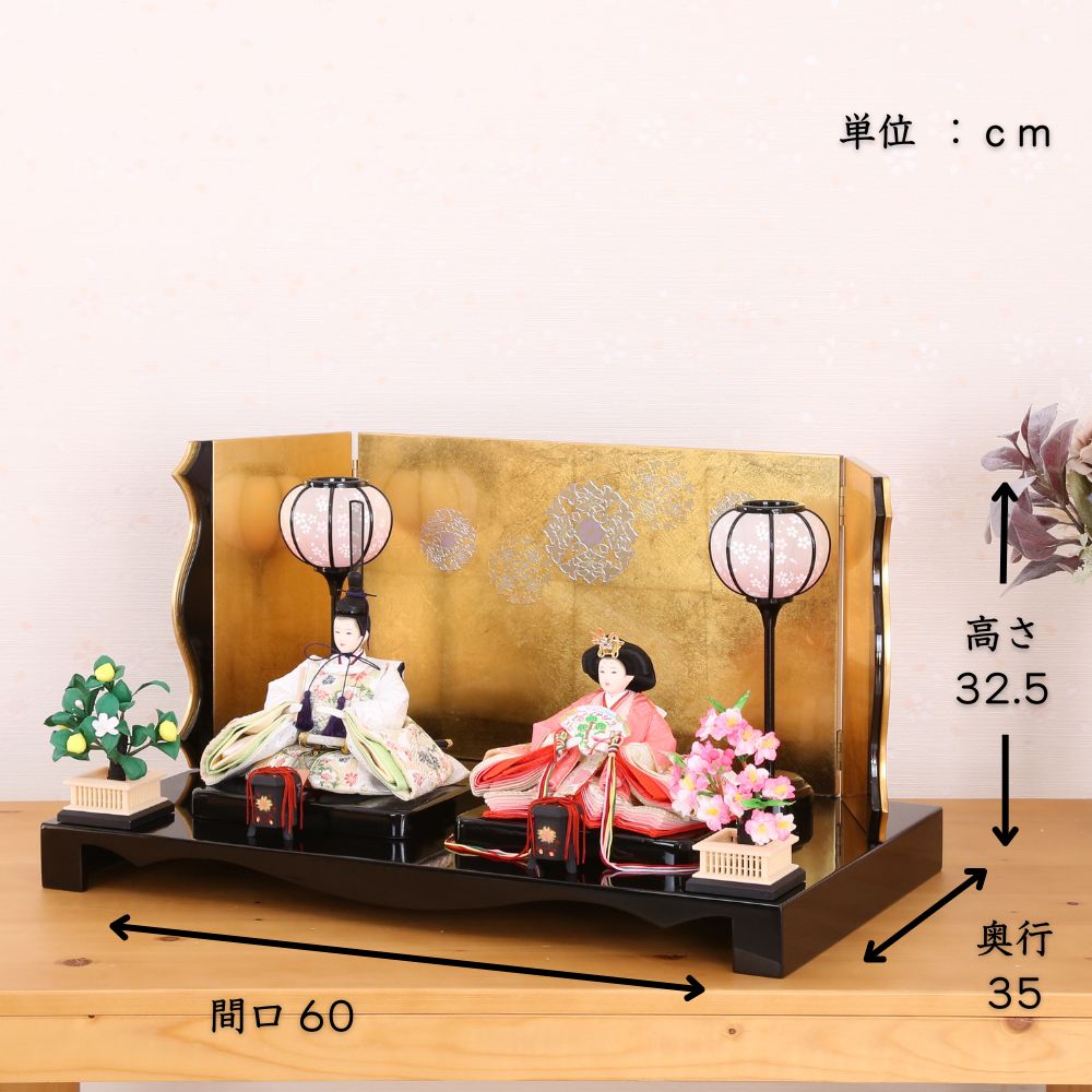 また、当店限定オリジナルのぷり姫シリーズは、キラキラ輝くストーンのついたティアラ風な玉串や、お顔はプリンセス仕様、現代風に仕上げた雛人形です。 間口(横幅)60×奥行35×高さ32.5(cm)サイズ