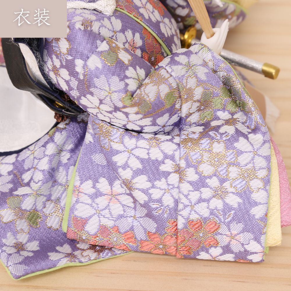 提灯タイプの照明がおしゃれな和紙屏風のセット、そしてお雛様には京都西陣金襴織物のお着物を合わせました。男雛には紫、女雛にはピンク色を基調とし小桜柄が織り出されています。