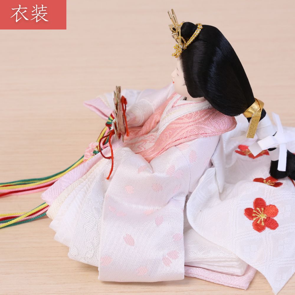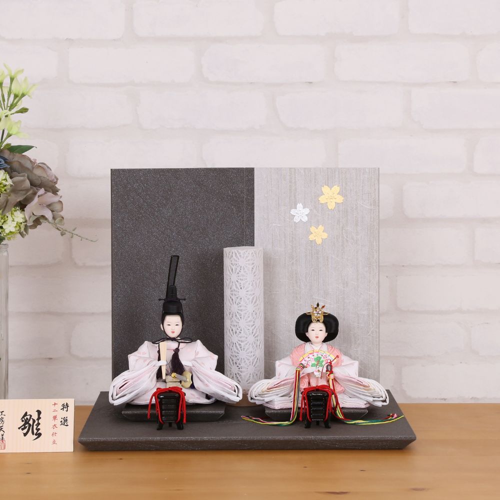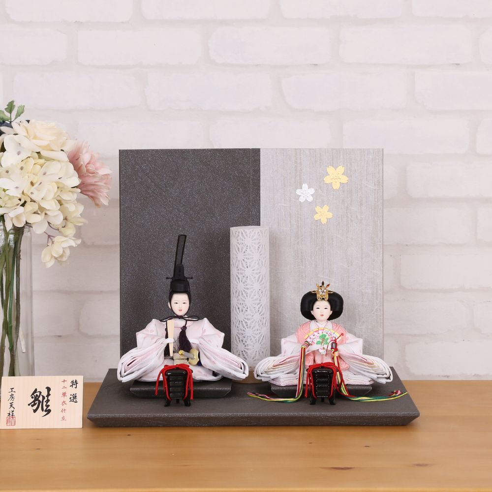 横幅35cmとコンパクトな台屏風セットに、白地にピンク色の桜の花びらが織り出された京都西陣金襴織物のお着物をお召しになられた柳親王のお雛様を合わせました。
