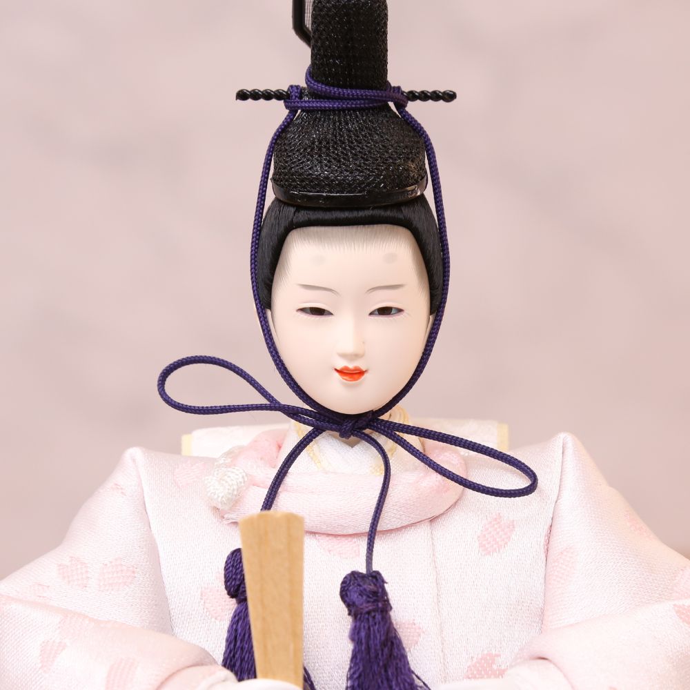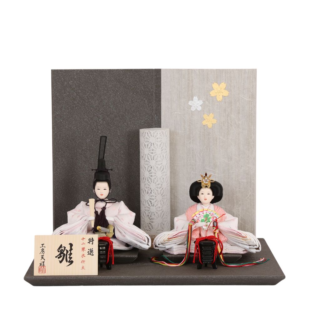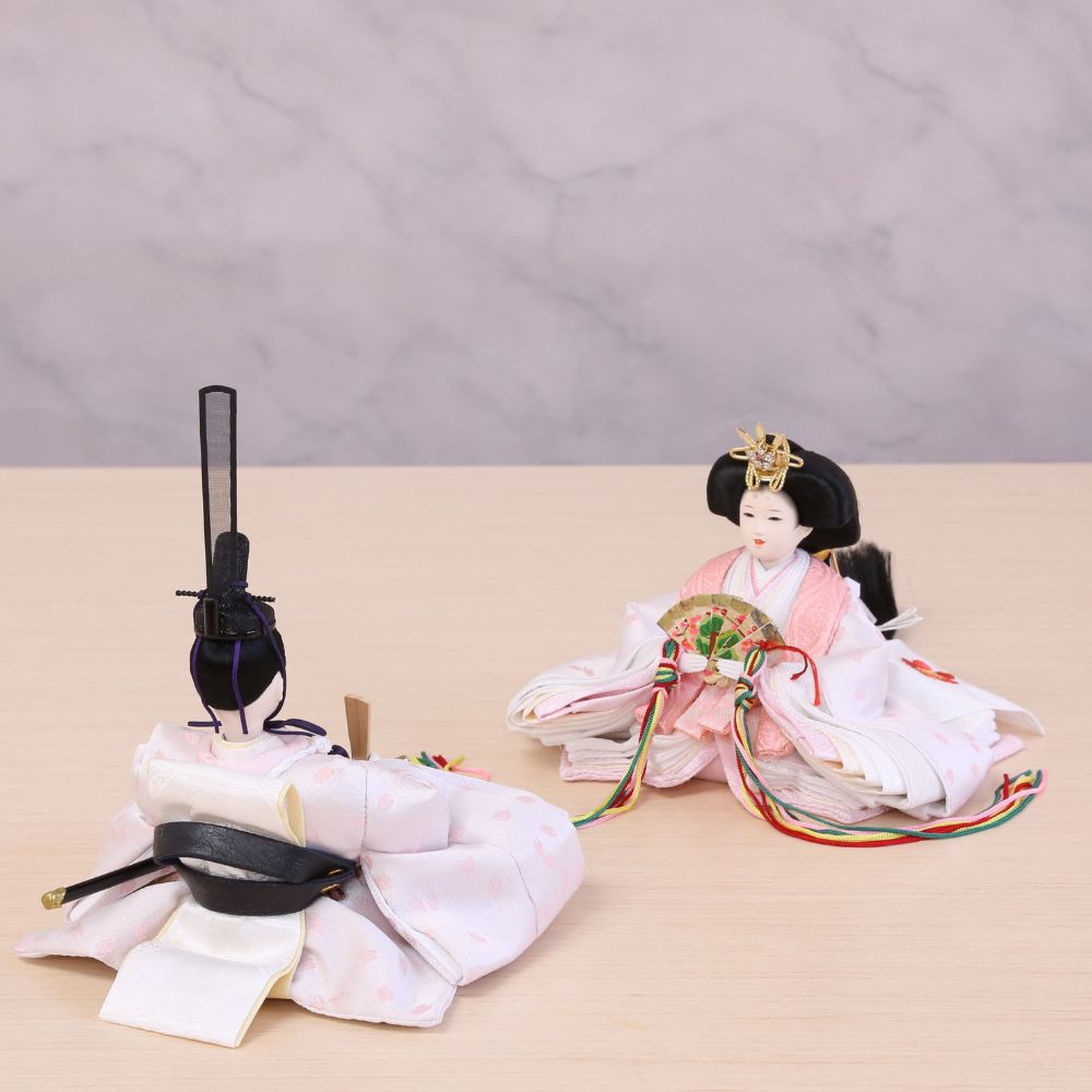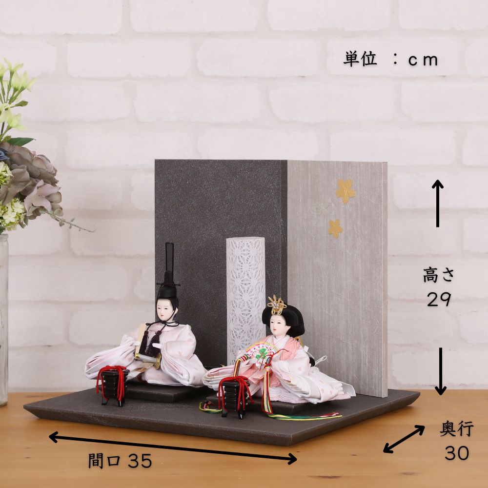 横幅35cmとコンパクトな台屏風セットに、白地にピンク色の桜の花びらが織り出された京都西陣金襴織物のお着物をお召しになられた柳親王のお雛様を合わせました。