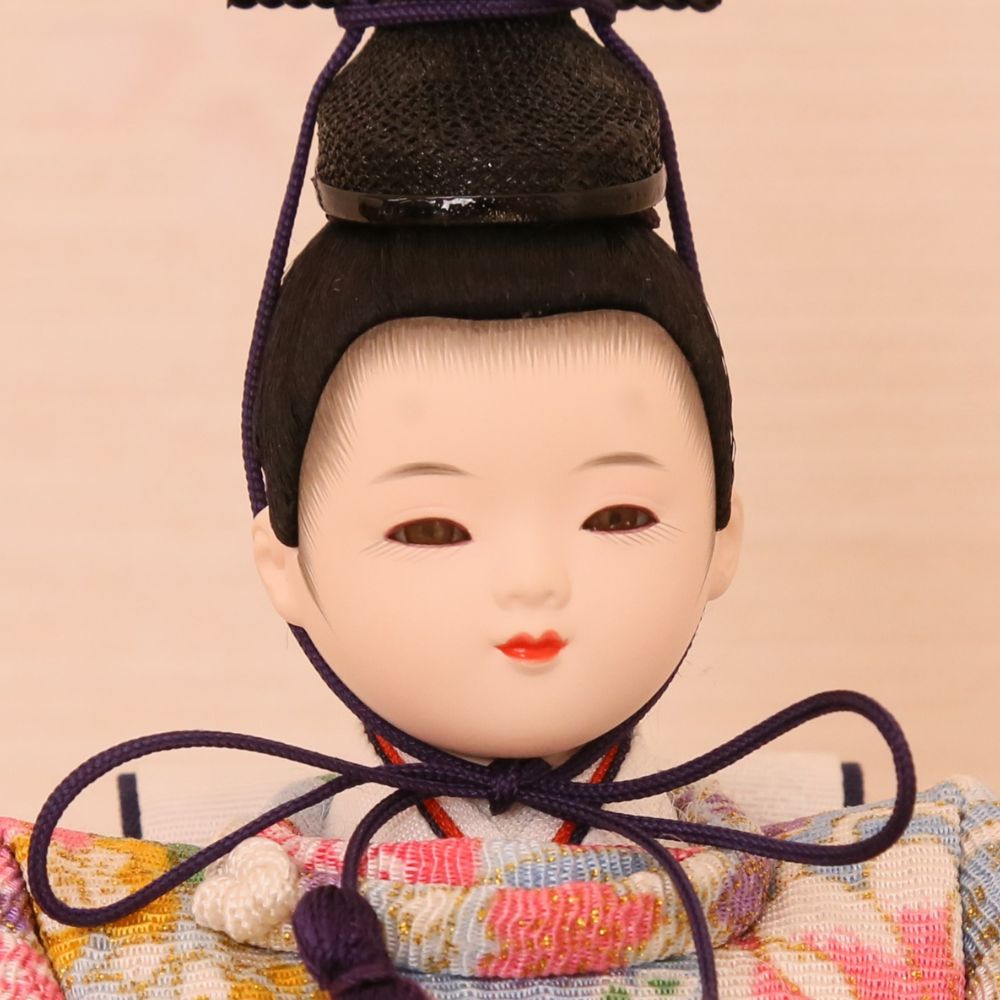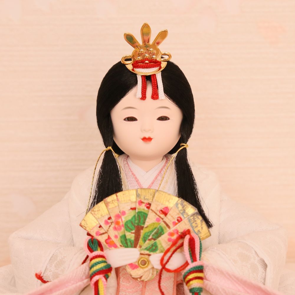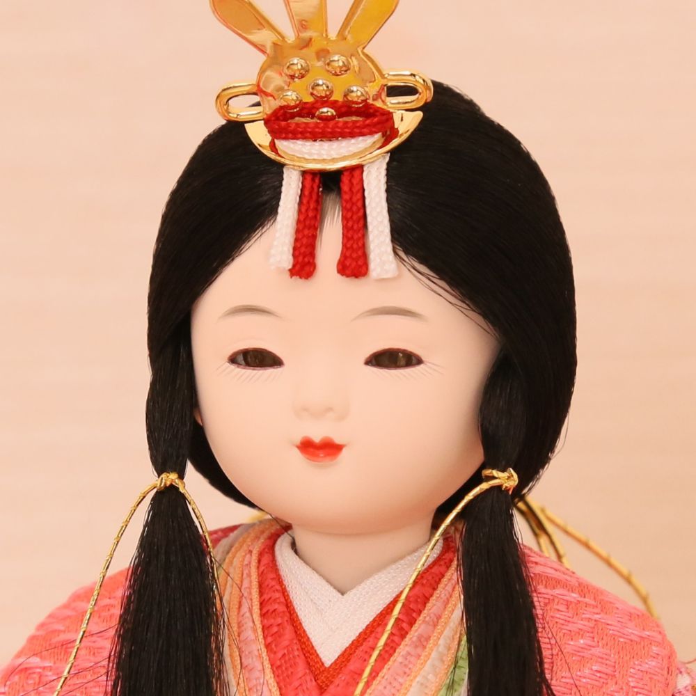 また、衣装着ひな人形としては珍しいお下げ髪スタイルで、当店限定数のみのお顔は、黒目がちな大きな目と親しみやすくかわいい表情が魅力的。