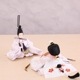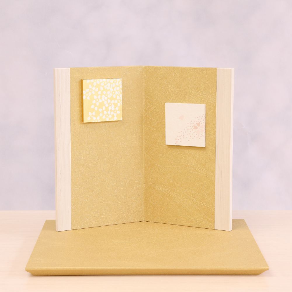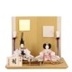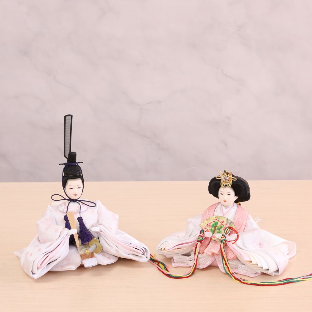 横幅35cmとコンパクトな台屏風セットに、白地にピンク色の桜の花びらが織り出された京都西陣金襴織物のお着物をお召しになられた柳親王のお雛様を合わせました。