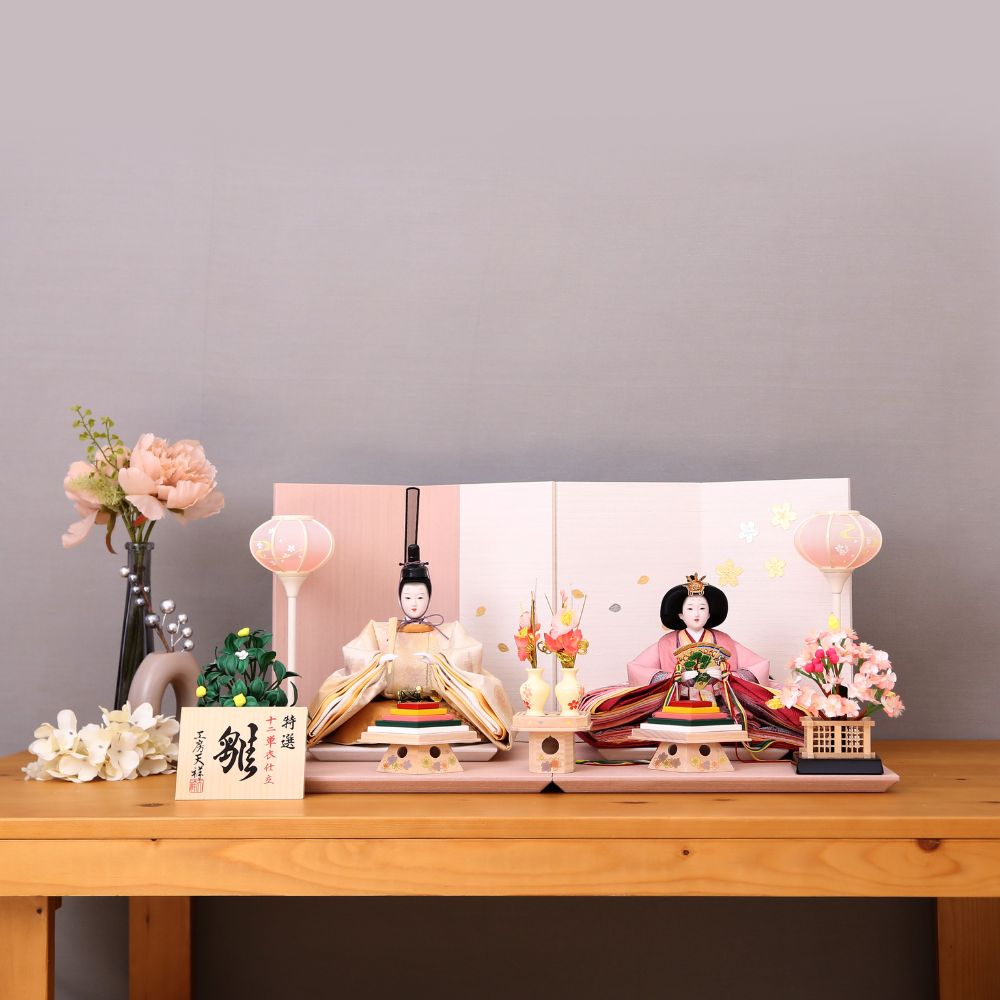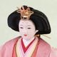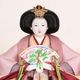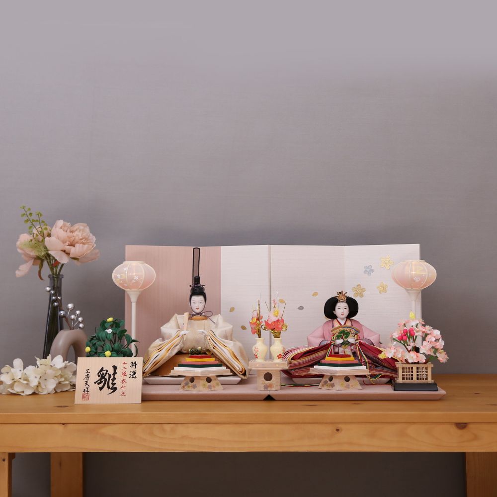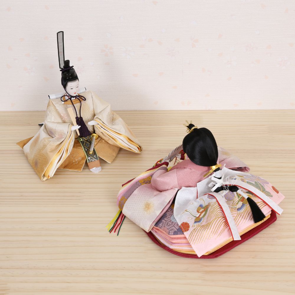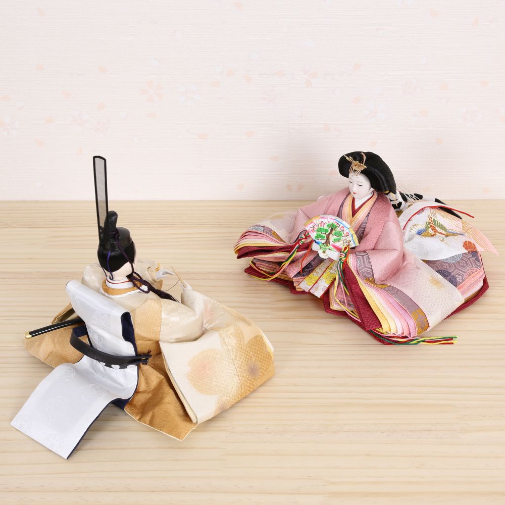 男雛には優しく深みのある色合わせ、女雛には“紅梅色”という紫がかったピンク色に、桜柄があしらわれた気品あるデザインのお衣裳です。