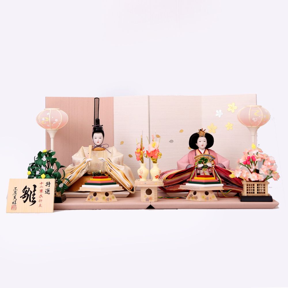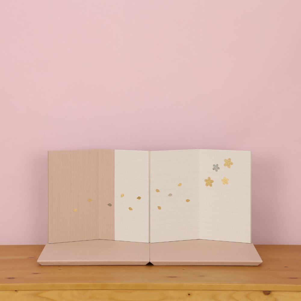 金銀箔押しの桜モチーフが付いた屏風セットに、一目で分かる上質感、正絹ちりめん織物から仕立てた衣装のお雛様を合わせています。 間口(横幅)60×奥行35×高さ29(cm)
