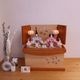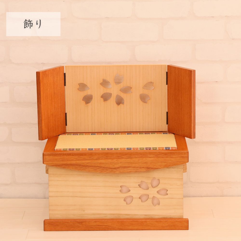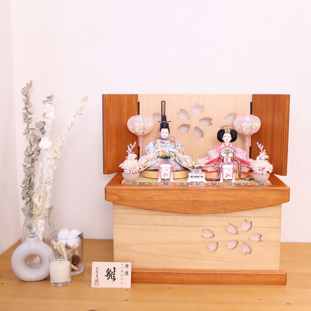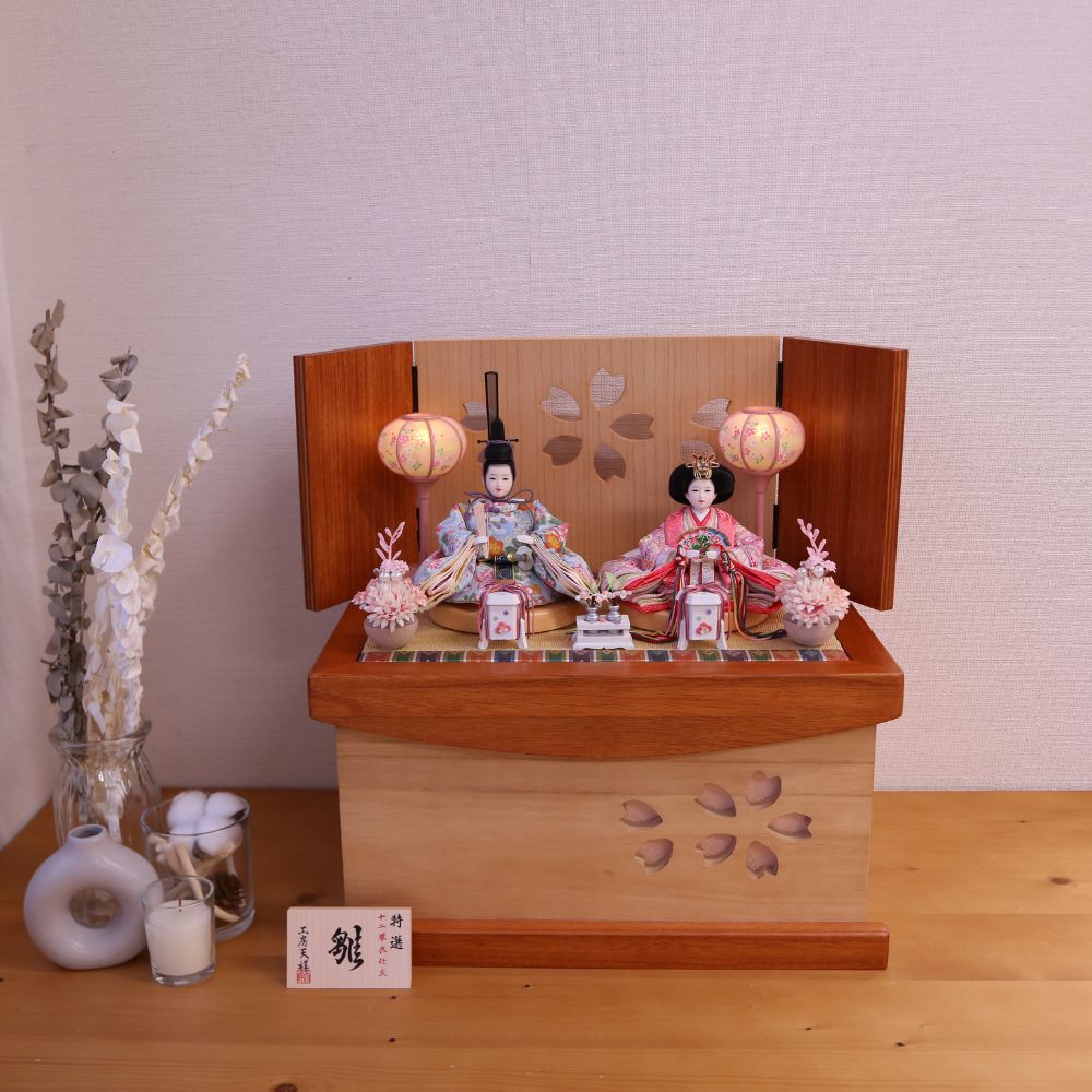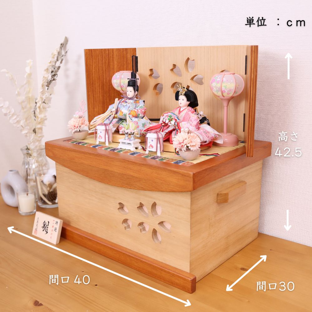 木製の飾り台と屏風には、さくら型抜きが加工された、おしゃれな雛人形セットです。家具にも馴染みやすく、木の温かみが感じられる収納飾りは、お人形やお道具、屏風にいたるまで全てが飾り台に収めることが出来る優れもの。