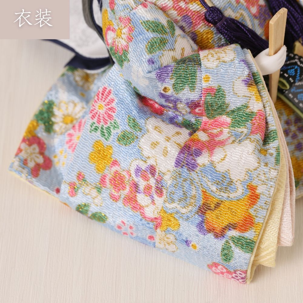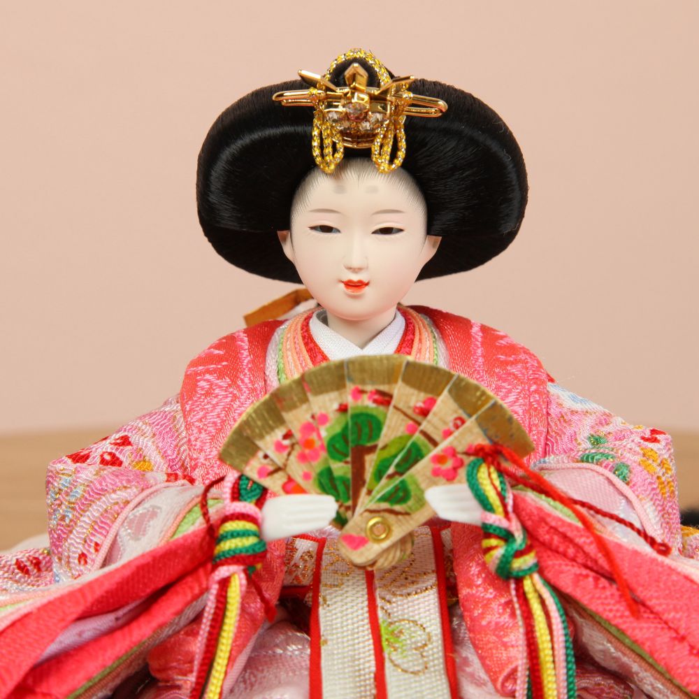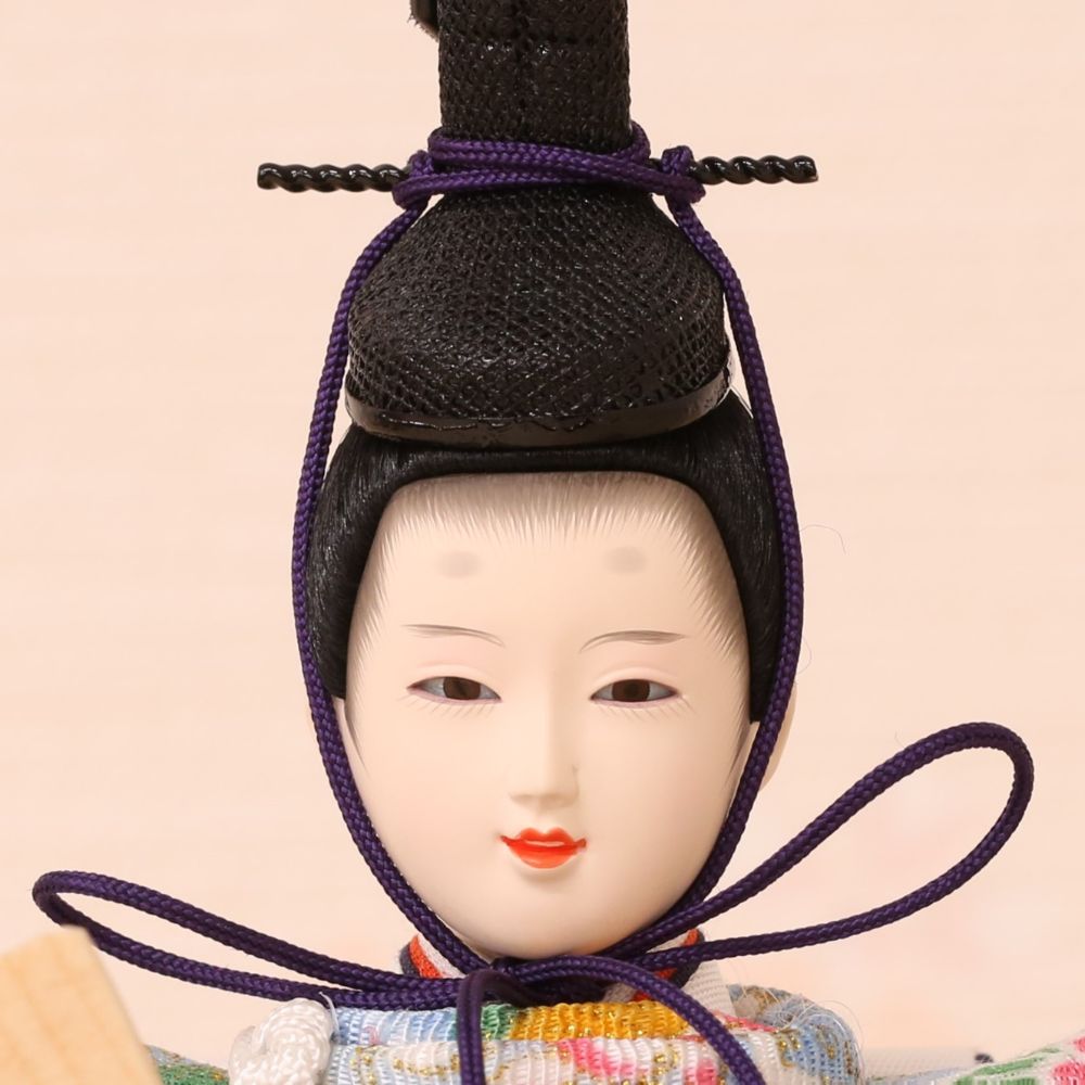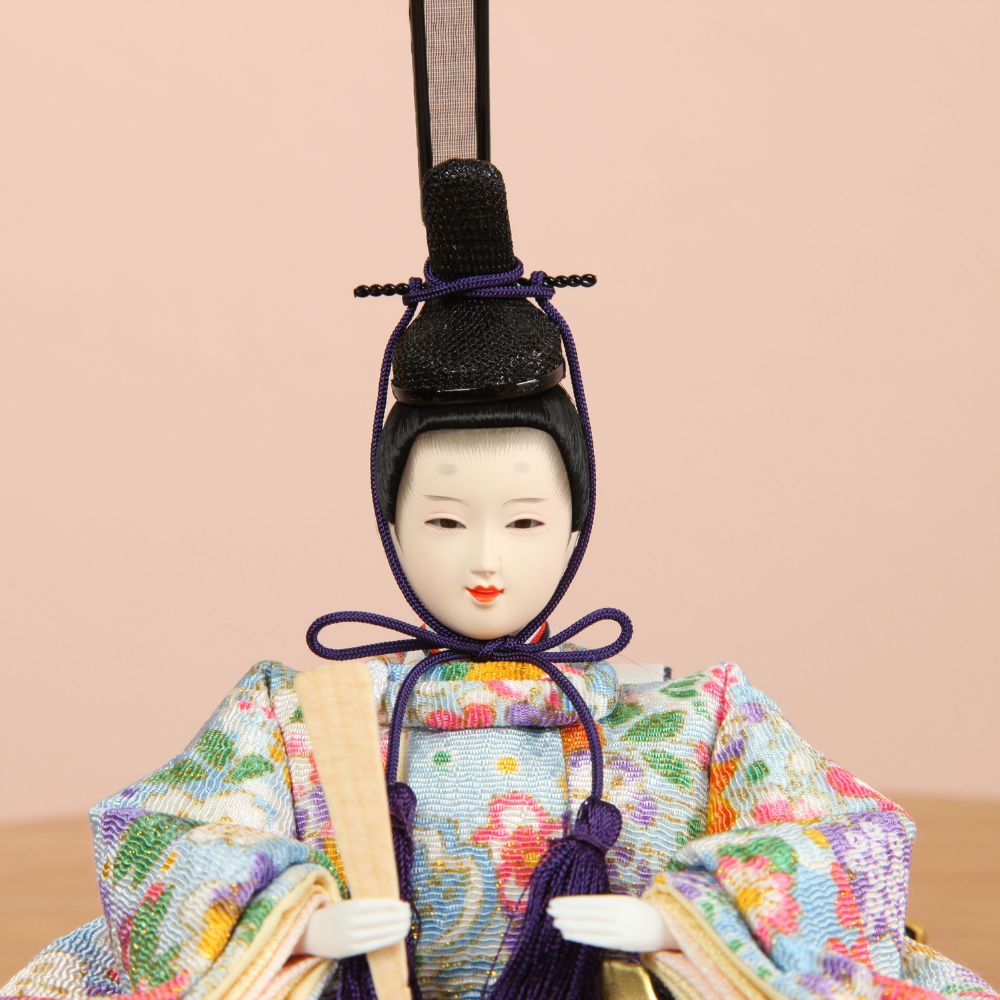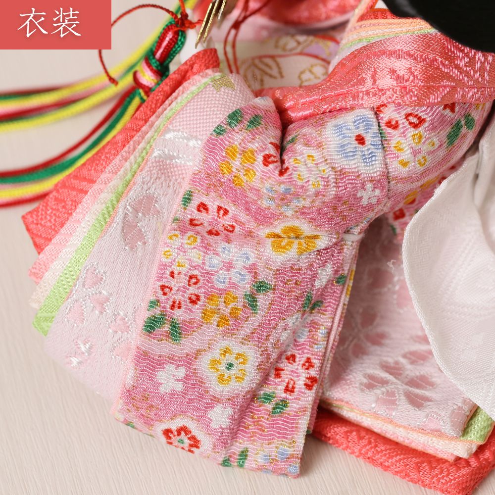 そして男雛には水色、女雛にはピンク色を基調とし桜柄のちりめん裂地のお衣裳で、かわいい古典的な印象があるお雛様です。