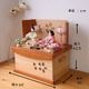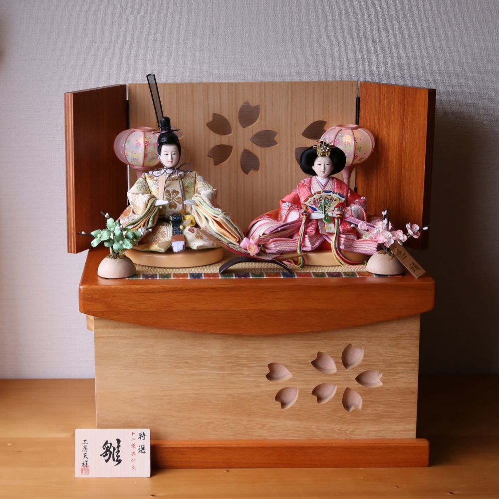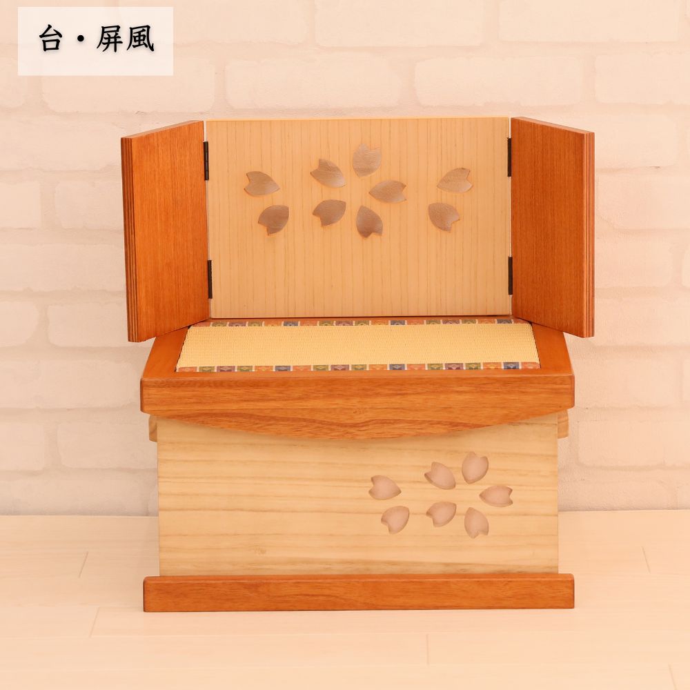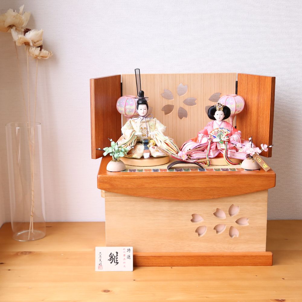 木製の飾り台と屏風には、さくら型抜きが加工された、おしゃれな雛人形セットです。家具にも馴染みやすく、木の温かみが感じられる収納飾りは、お人形やお道具、屏風にいたるまで全てが飾り台に収めることが出来る優れもの。