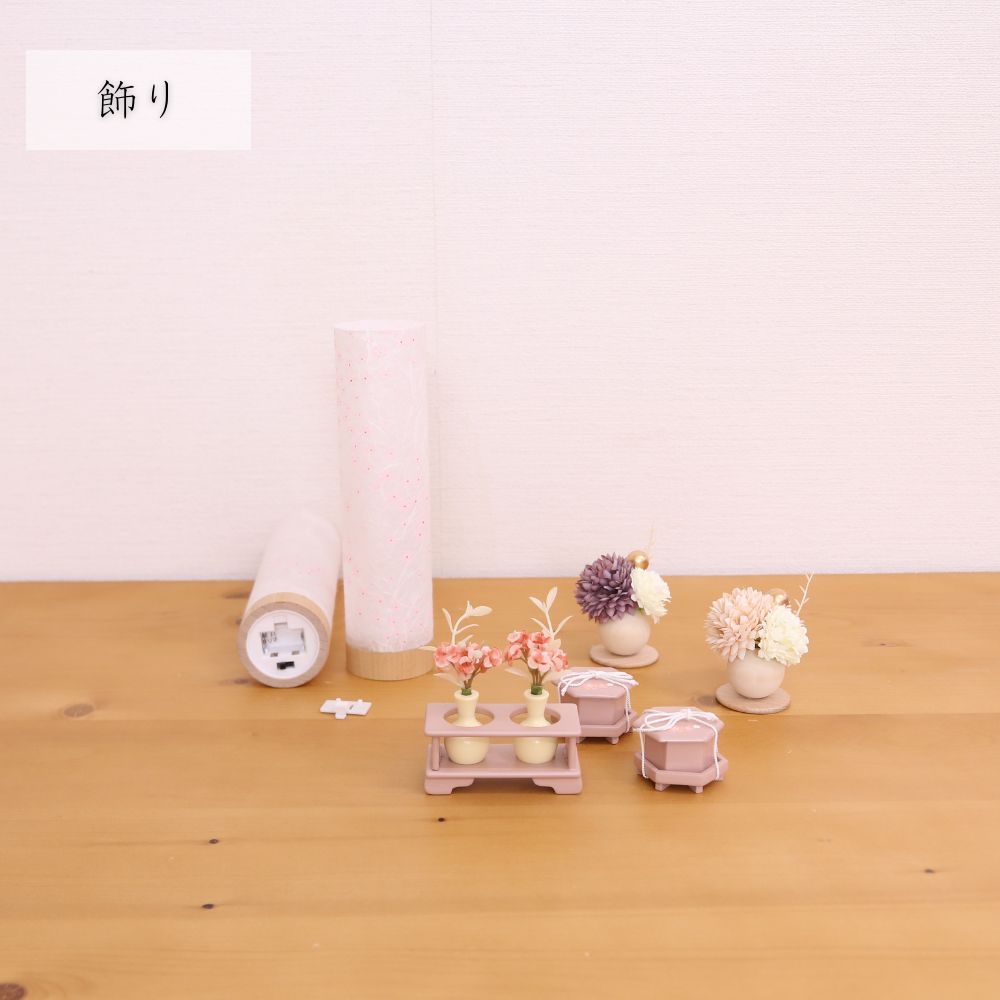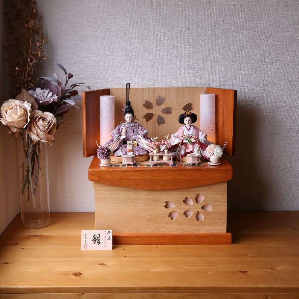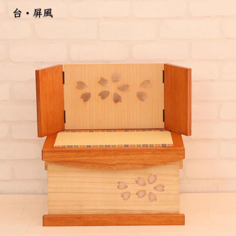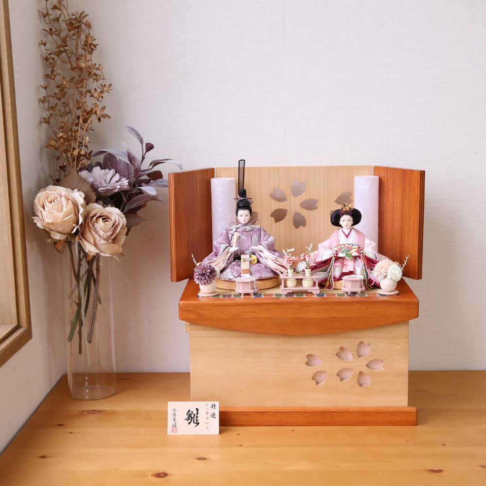 木製の飾り台と屏風には、さくら型抜きが加工された、おしゃれな雛人形セットです。家具にも馴染みやすく、木の温かみが感じられる収納飾りは、お人形やお道具、屏風にいたるまで全てが飾り台に収めることが出来る優れもの。