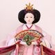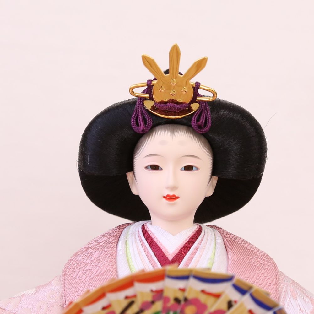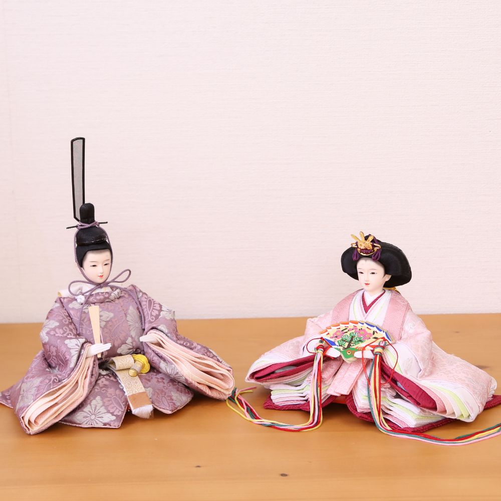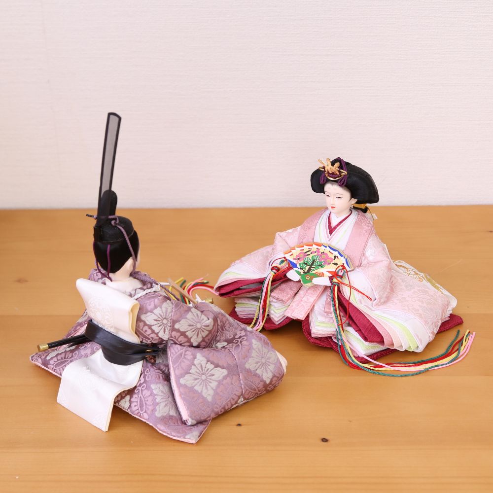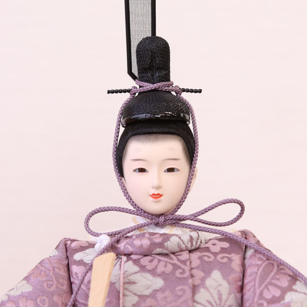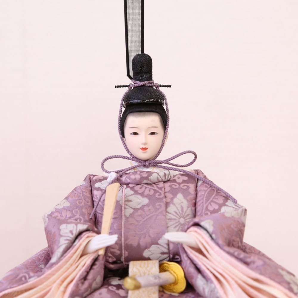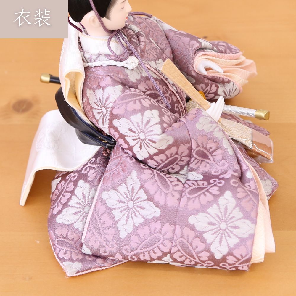 そして男雛には紫系、女雛にはピンク色を基調とし菱文様柄を織り出した京都西陣金襴織物のお衣裳で、華やかな印象があるお雛様です。