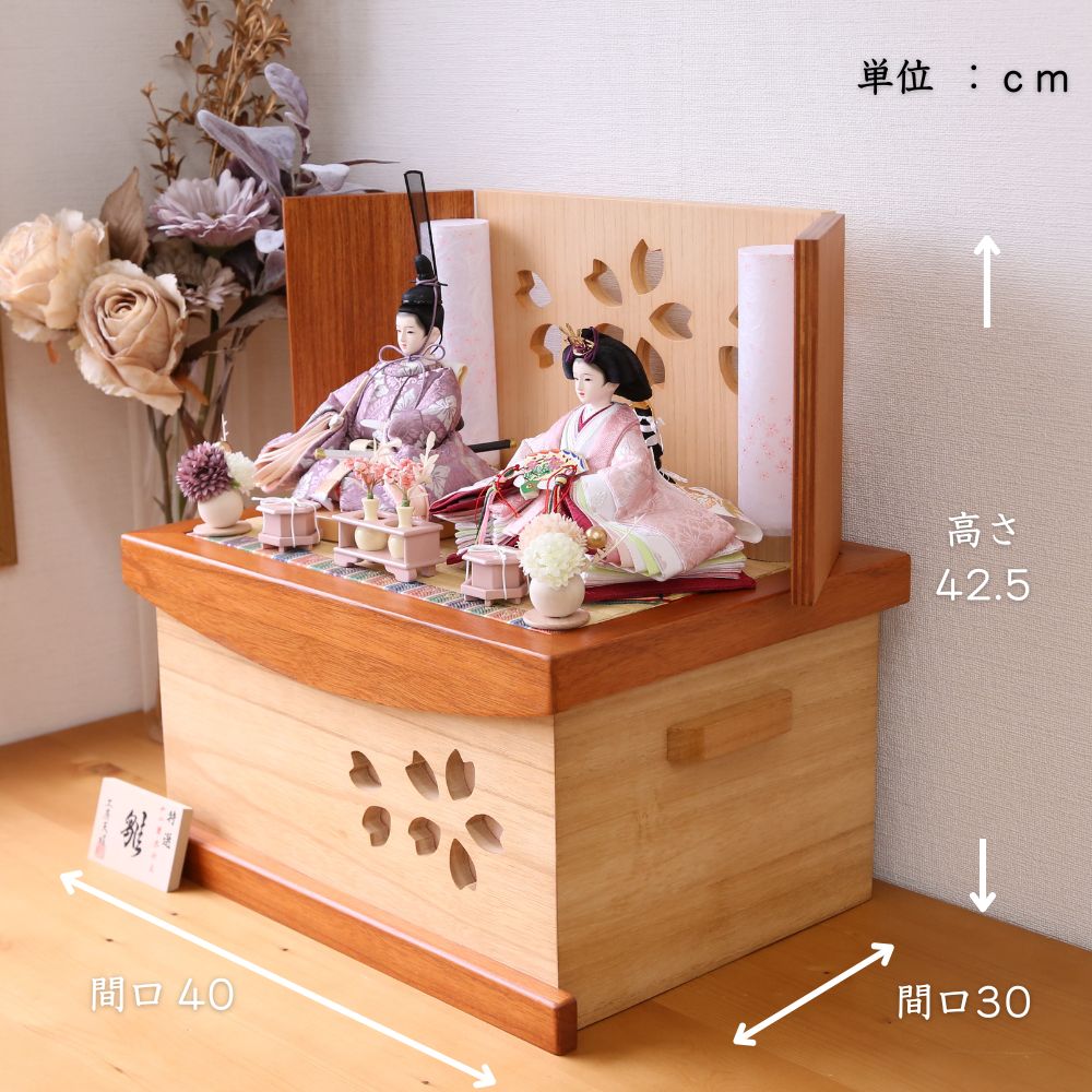 また、美しい雰囲気と可愛らしい表情のどちらも兼ね備えているお顔は、工房天祥オリジナル、人気の親王飾りです。 間口(横幅)40×奥行30×高さ42.5(cm)サイズ