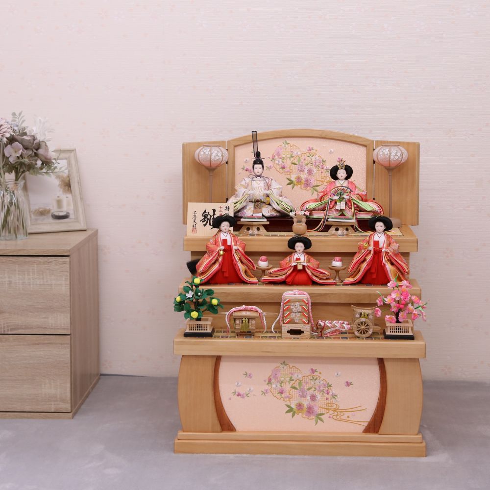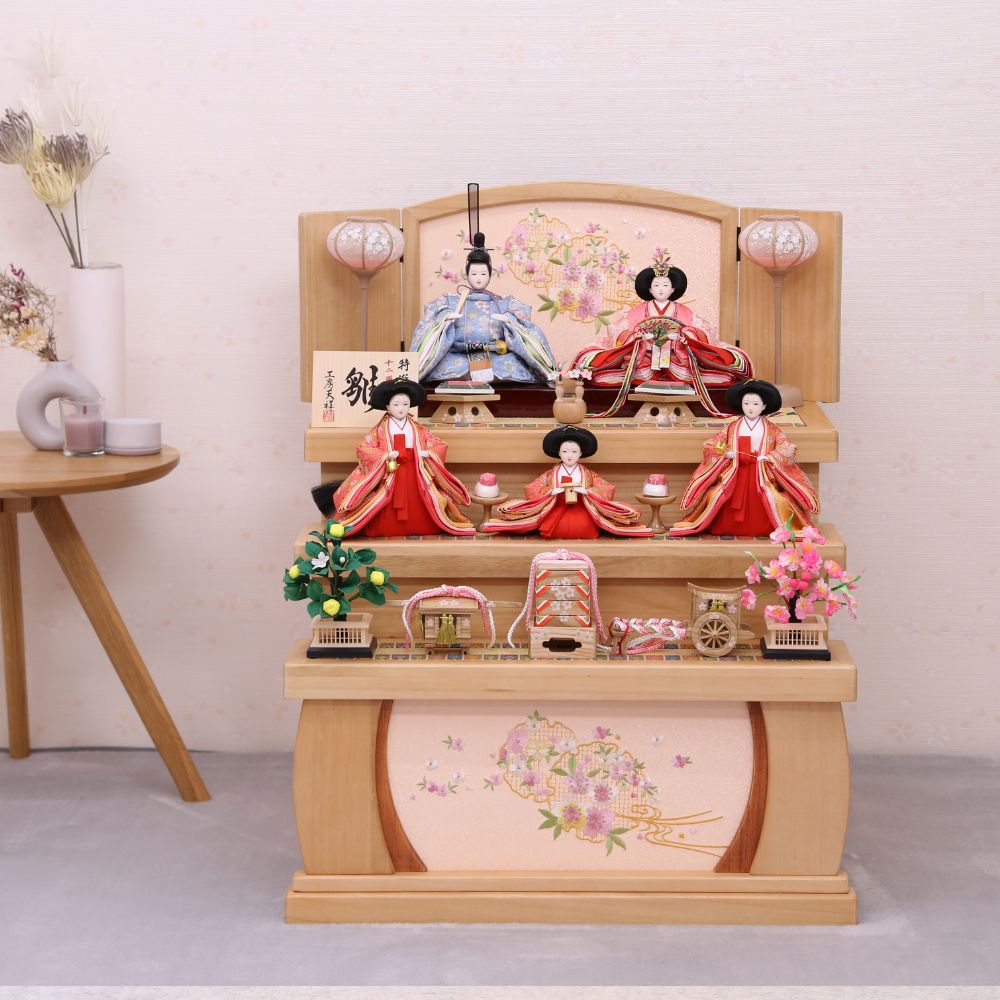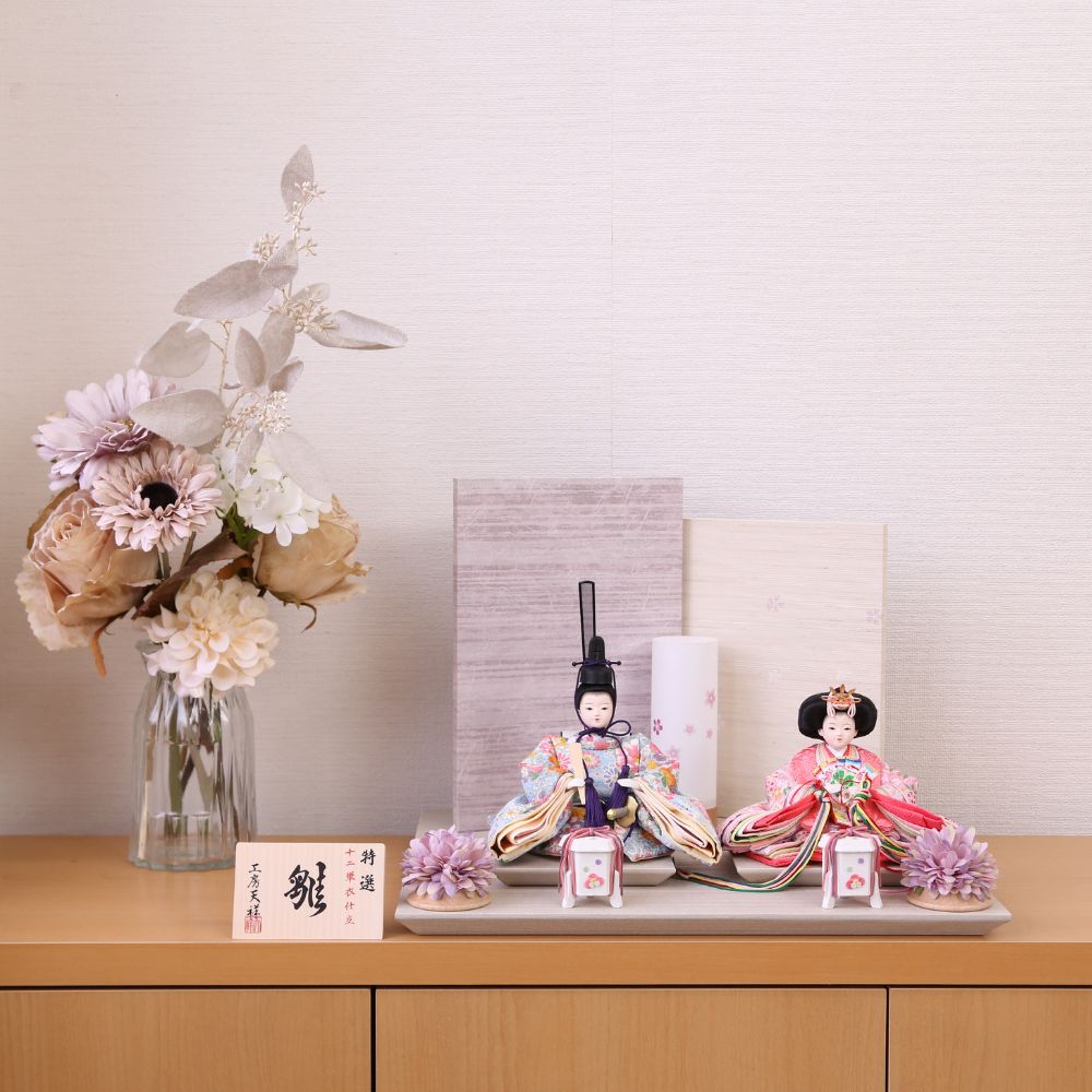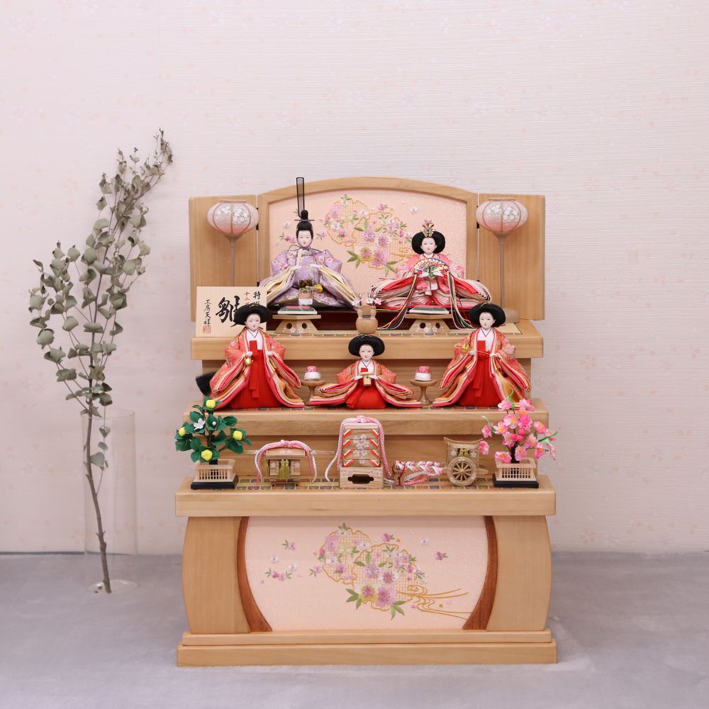 雛人形 ひな人形 宴桜 コンパクト 上芥子親王飾り おしゃれ モダン インテリア ひのき木製台屏風 横幅60cm 木目 ピンク 紫 パステルカラー 初節句 女の子 お祝い 桃の節句 ひな祭り