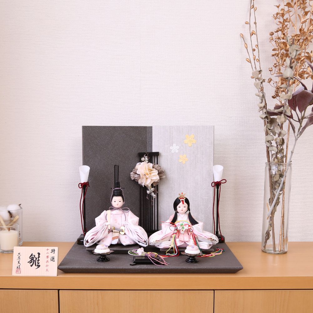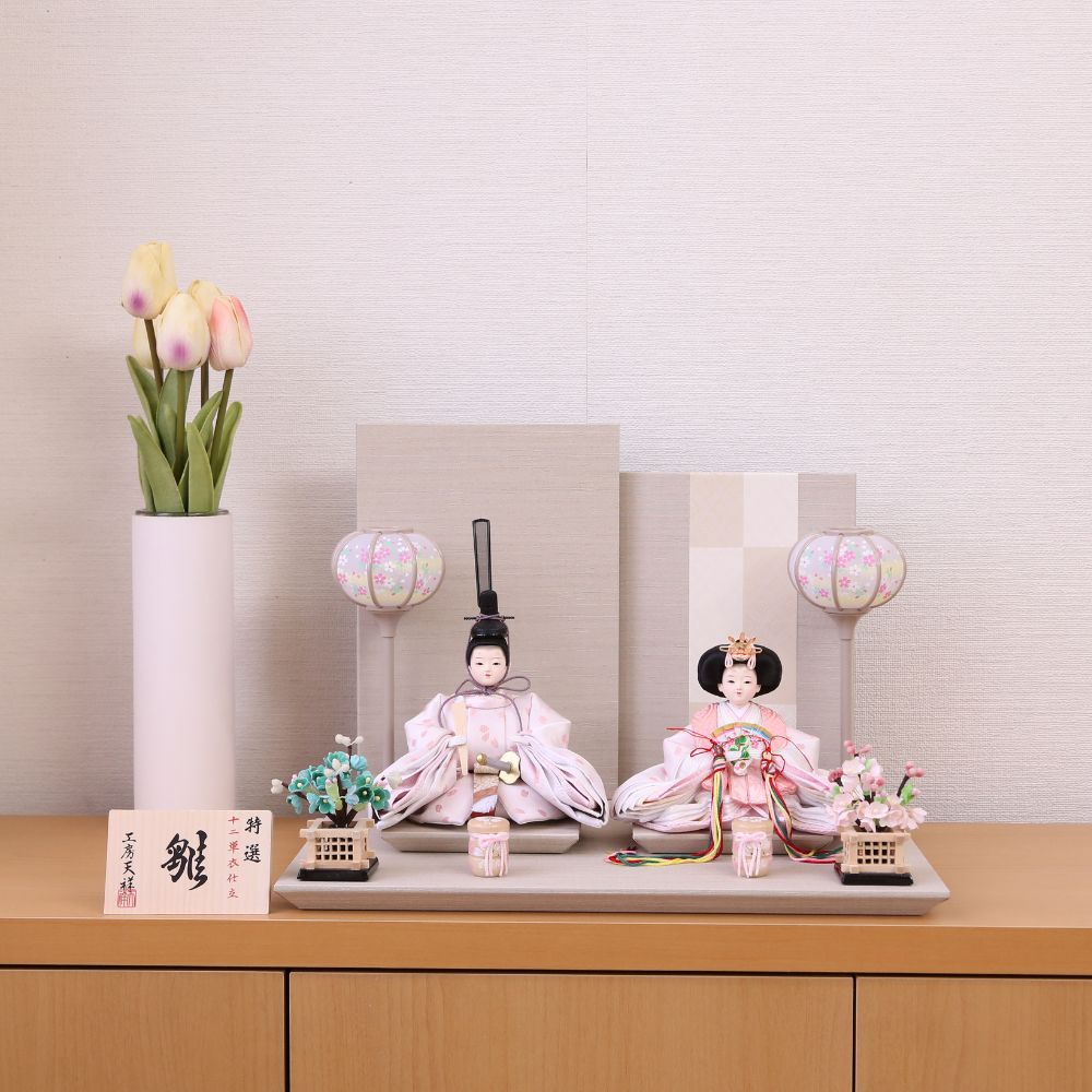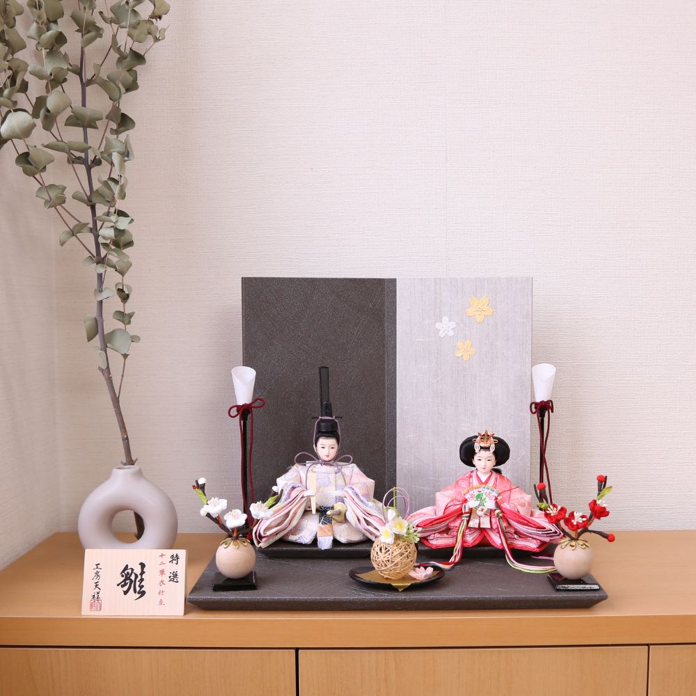 雛人形 コンパクト ひな人形 親王飾り 柳親王 二曲屏風 かわいい ひな人形 小さい 横幅35cm グレージュ モカ 白 ピンク 京都西陣織物 お祝い 初節句 ひな祭り 桃の節句 ティピ 灯りシリーズ
