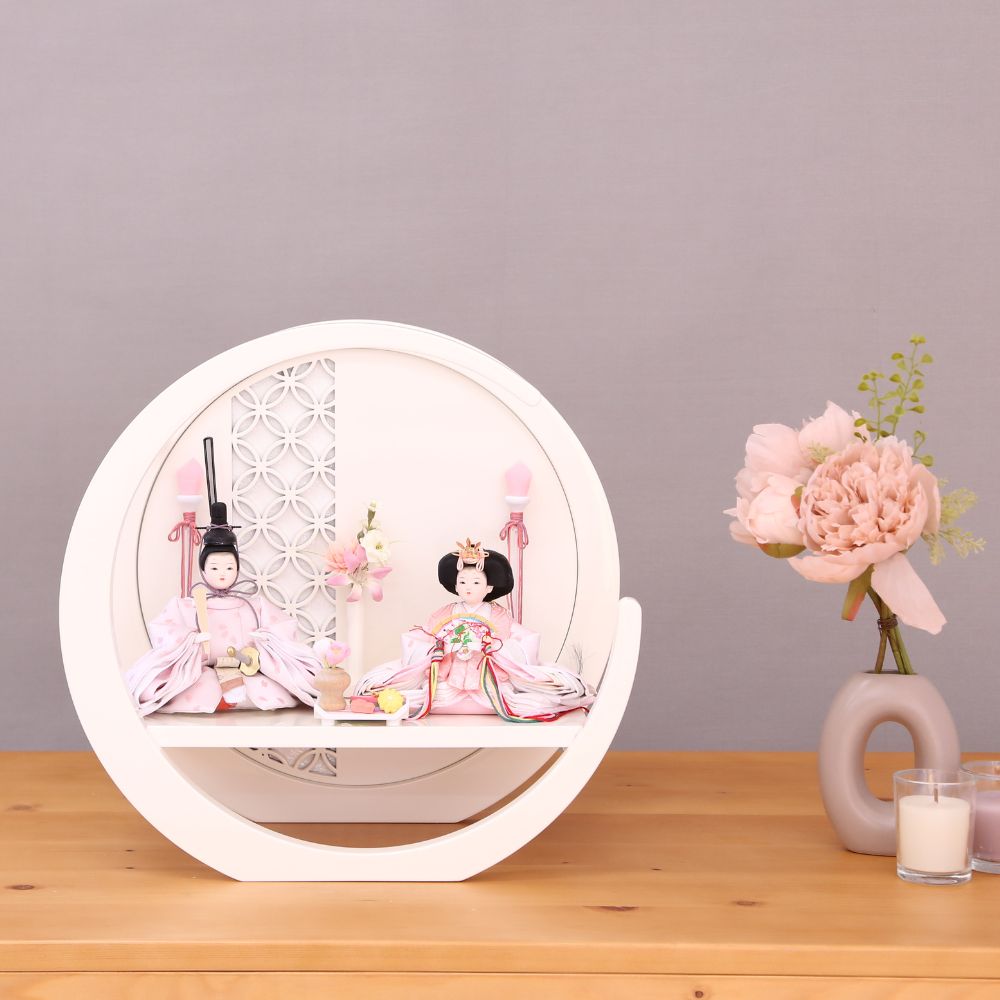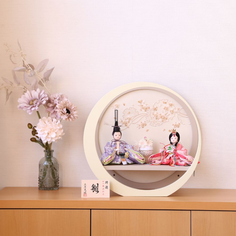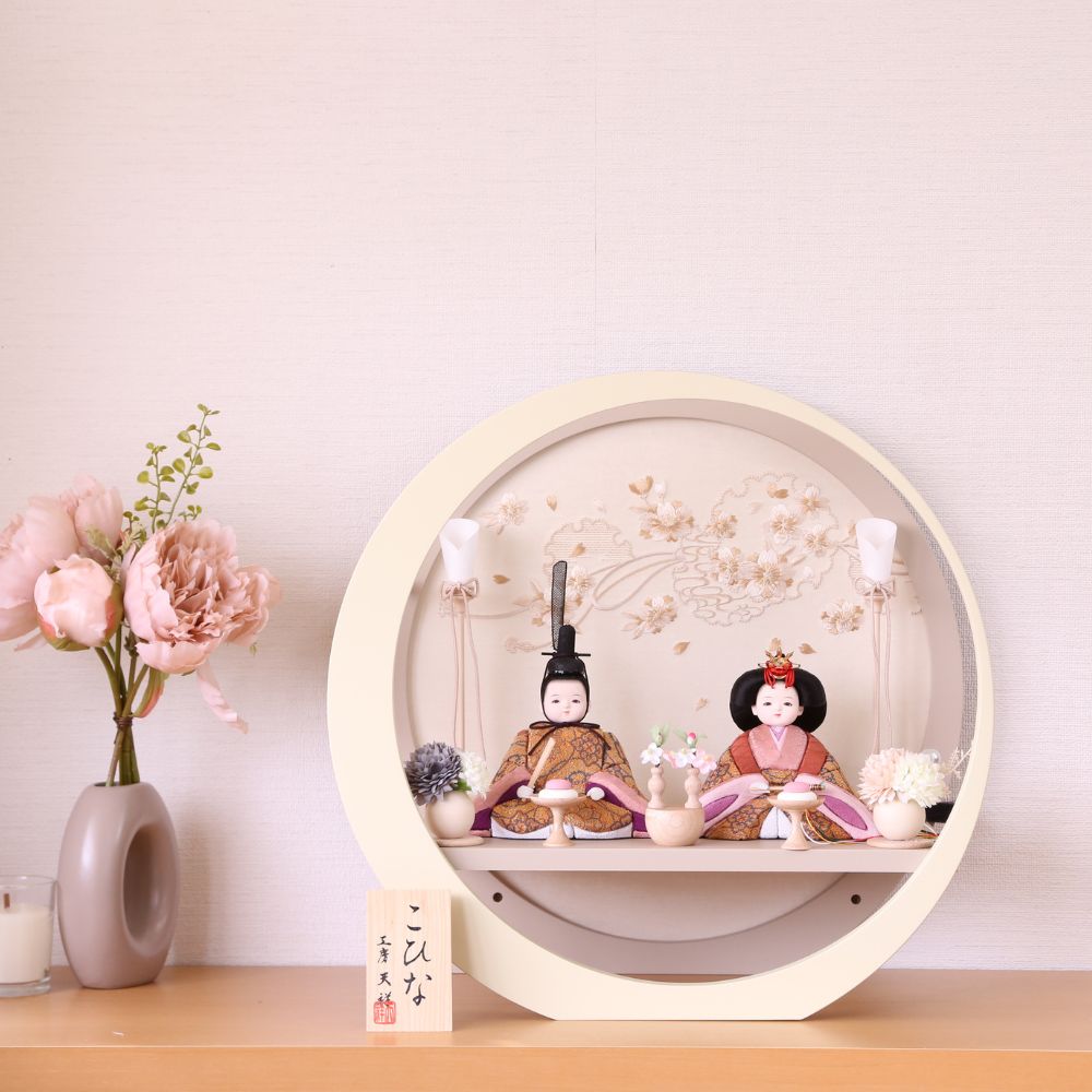 雛人形 ひな人形 宝童作 親王飾り 円型 ケース飾り奏 グレージュ 花 背景デザイン