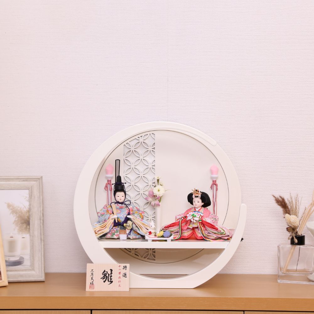 雛人形 ひな人形 宝童作 親王飾り 円型 ケース飾り 照明付き奏 オフホワイト 刺繍デザイン