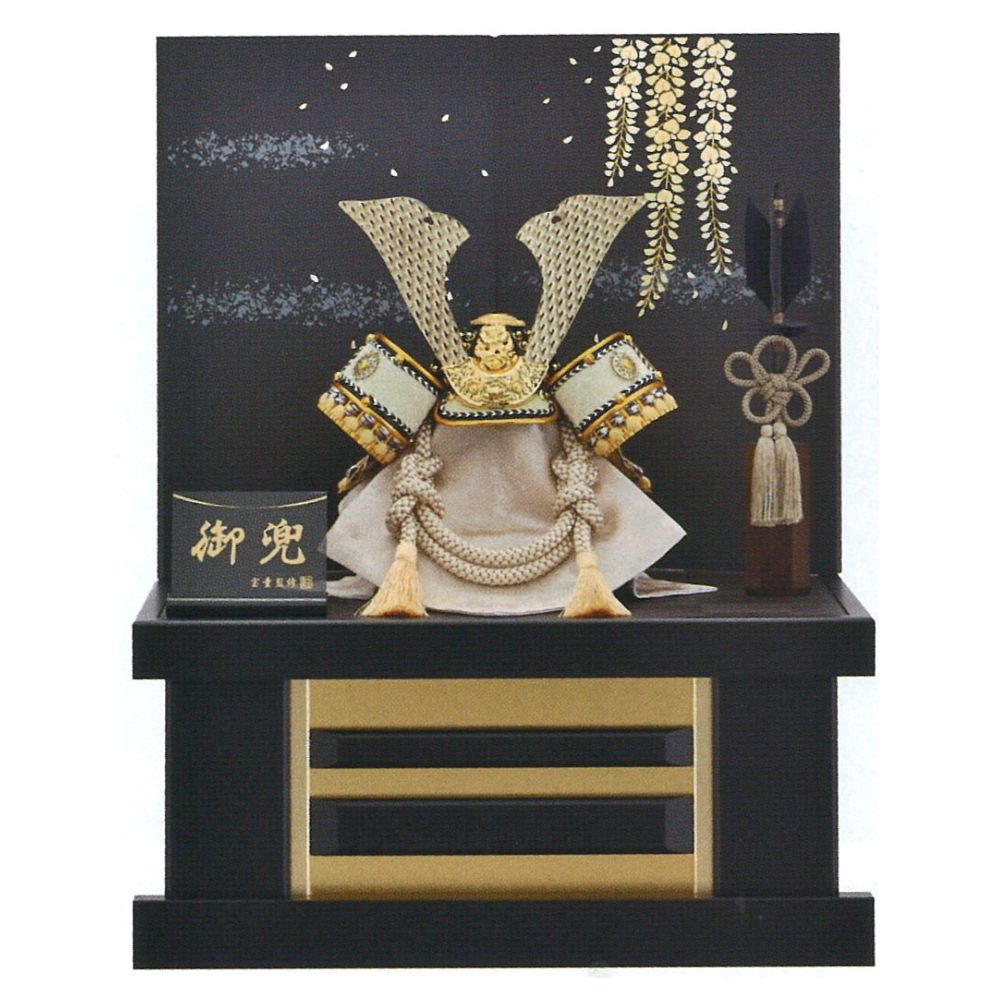 コンパクト 五月人形 兜飾り 宝童作 三曲収納飾り 黒銀牡丹上杉兜 7号
